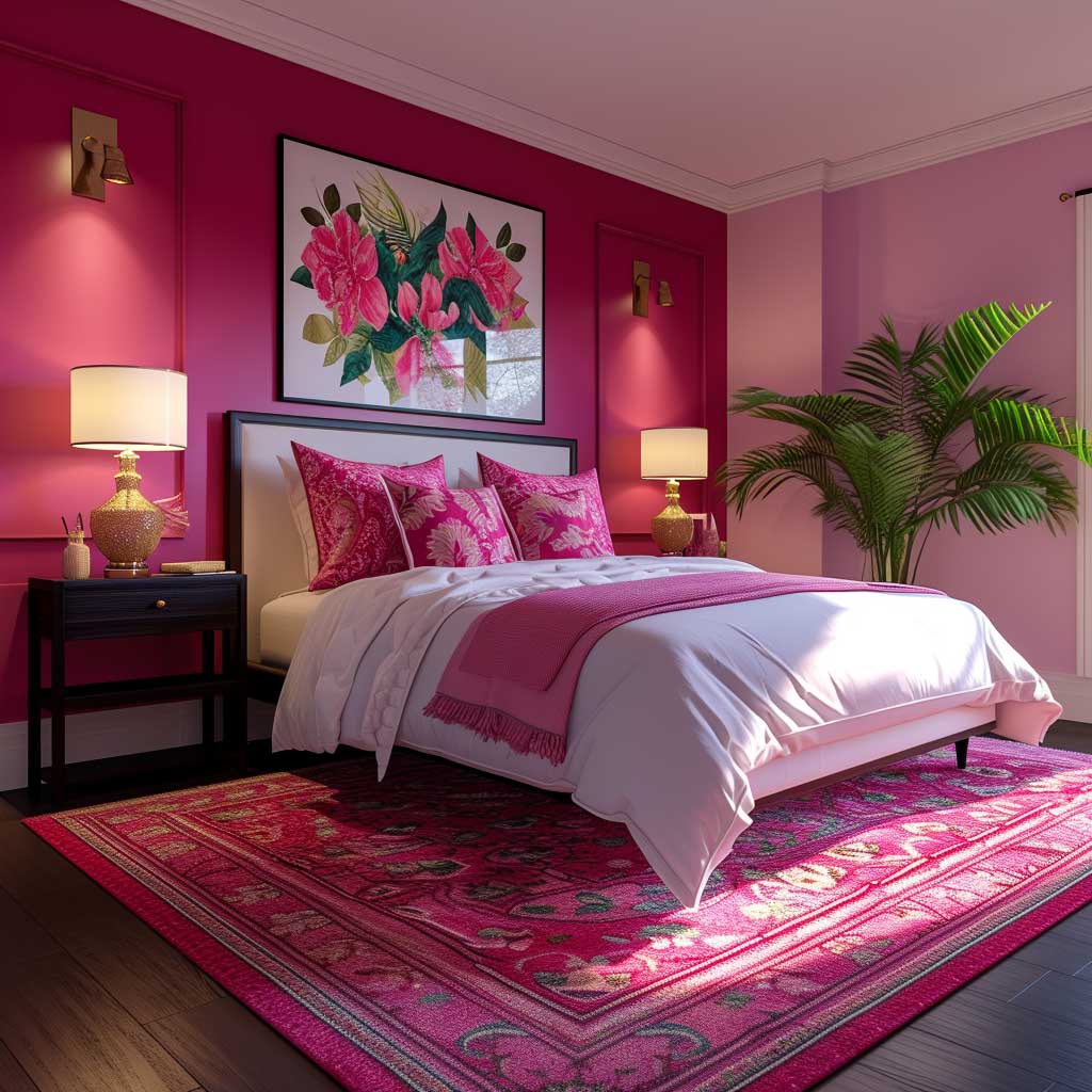 To complement the fuchsia statement wall, incorporating decorative elements and textiles in varying shades of pink and complementary colors can add layers of visual interest and texture. Plush throw pillows, luxurious blankets, and an area rug featuring geometric patterns or floral designs can integrate additional pink tones, weaving a tapestry of color that enriches the room’s aesthetic. These elements contribute to a sense of coziness and comfort, essential for a bedroom retreat.