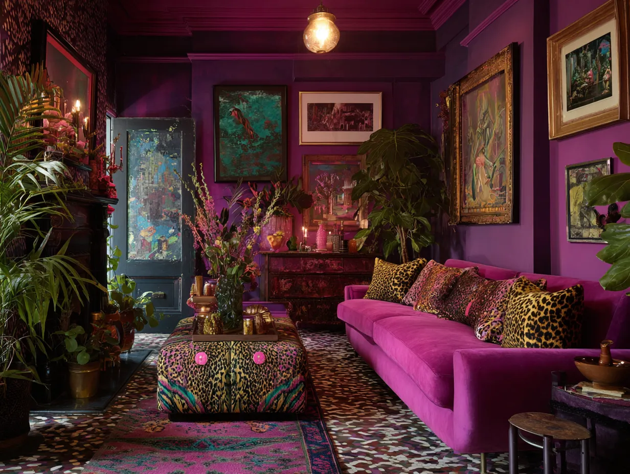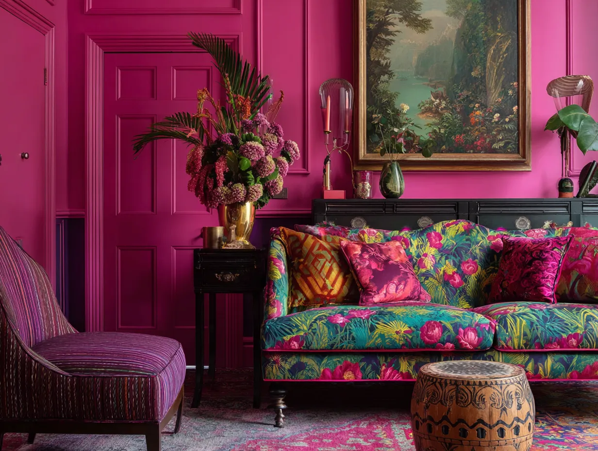 Against this refreshing, glossy green backdrop, the introduction of your secondary neon tone must be handled with monumental impact. The foyer requires functional furniture to serve as a drop zone for keys and mail, but in a space dedicated to maximalist home decor, this furniture must double as functional sculpture. Placing a heavily carved, vintage credenza or a hyper-modern, geometric console table entirely lacquered in blistering electric fuchsia creates an immediate, breathtaking juxtaposition against the mint door. The aggressive, warm intensity of the neon pink grounds the space, providing a heavy visual anchor that demands attention. This deliberate clash of cool, translucent energy and hot, opaque intensity is the absolute defining characteristic of this specific design movement. It proves that opposing colors do not just coexist; when applied with intense saturation and contrasting textures, they actively elevate one another, creating a dynamic visual friction that is impossible to ignore.