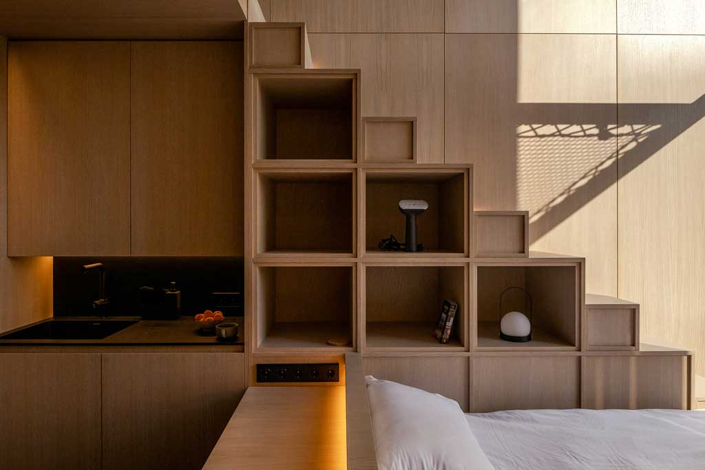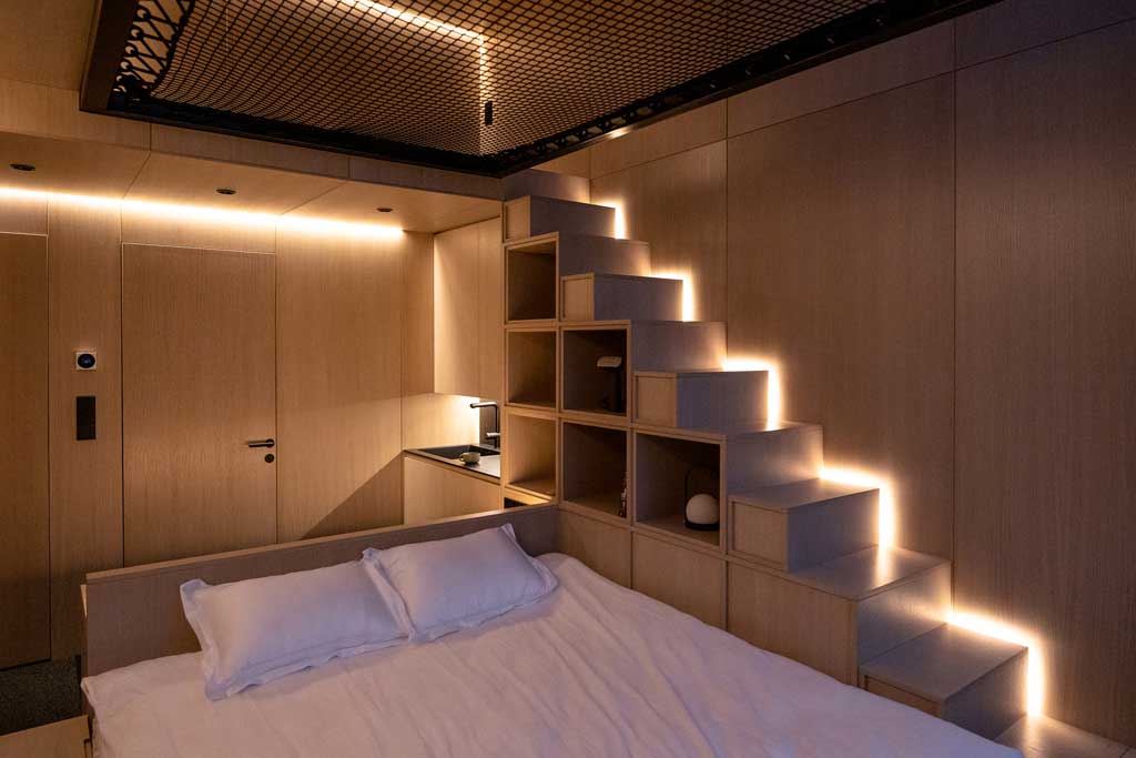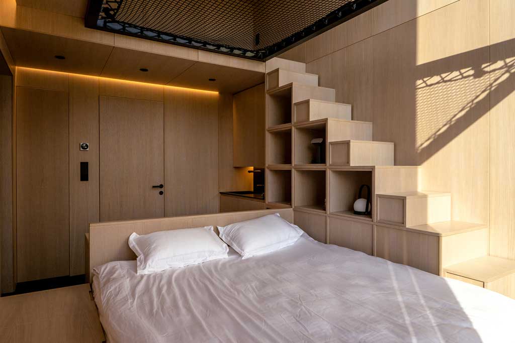 As you step inside, the treehouse reveals its second secret: an interior conceived entirely in white-washed oak. This choice of material gives the space a warm, cozy ambiance, reminiscent of traditional treehouses yet with a touch of modern elegance.