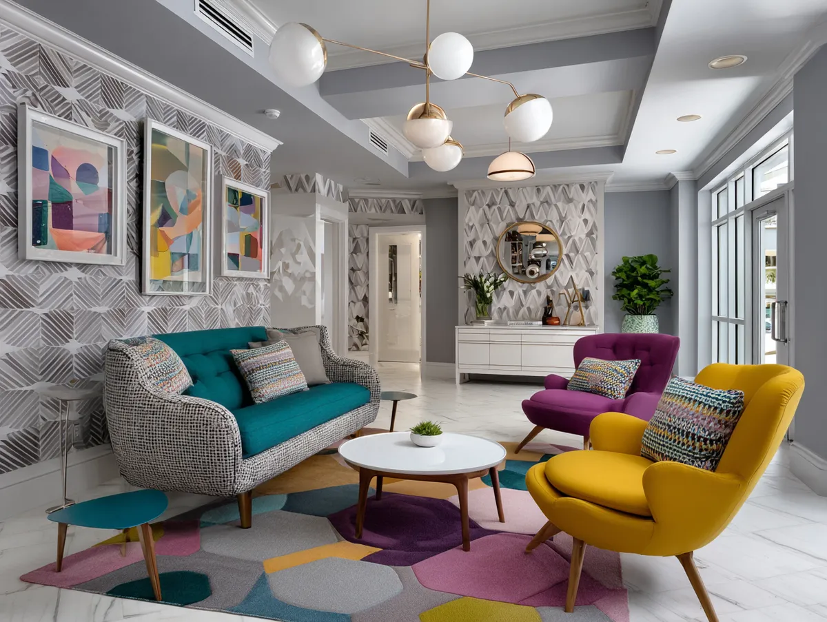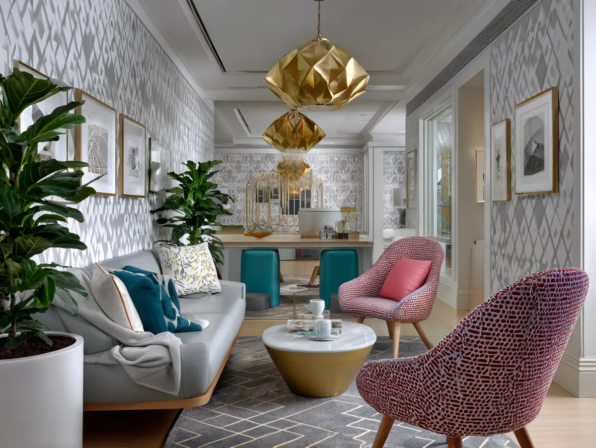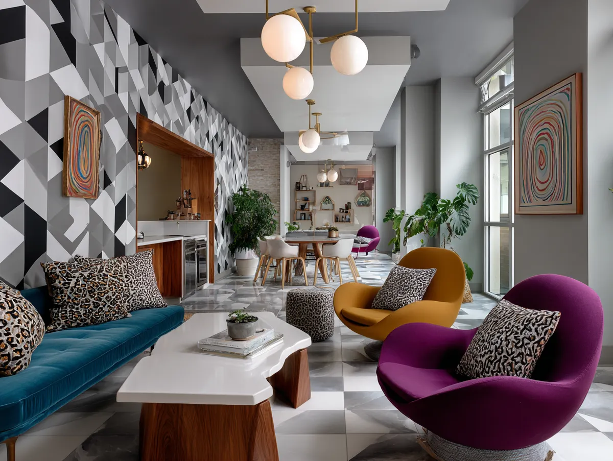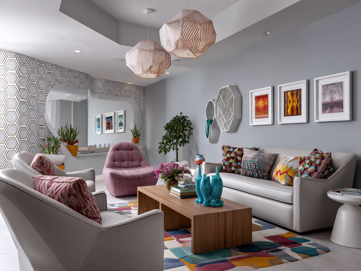 Hanging above the couch, geometric light fixtures cast a warm and welcoming glow throughout the room. These fixtures, with their sharp lines and angles, echo the shapes in the wallpaper and cushions, further amplifying the geometric theme. The lighting not only illuminates the space but also highlights the room’s key design elements.
