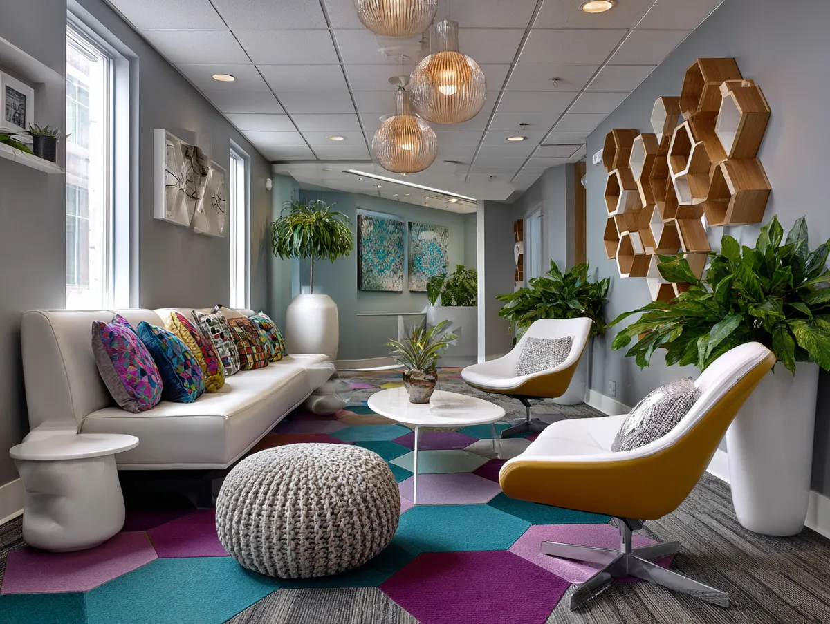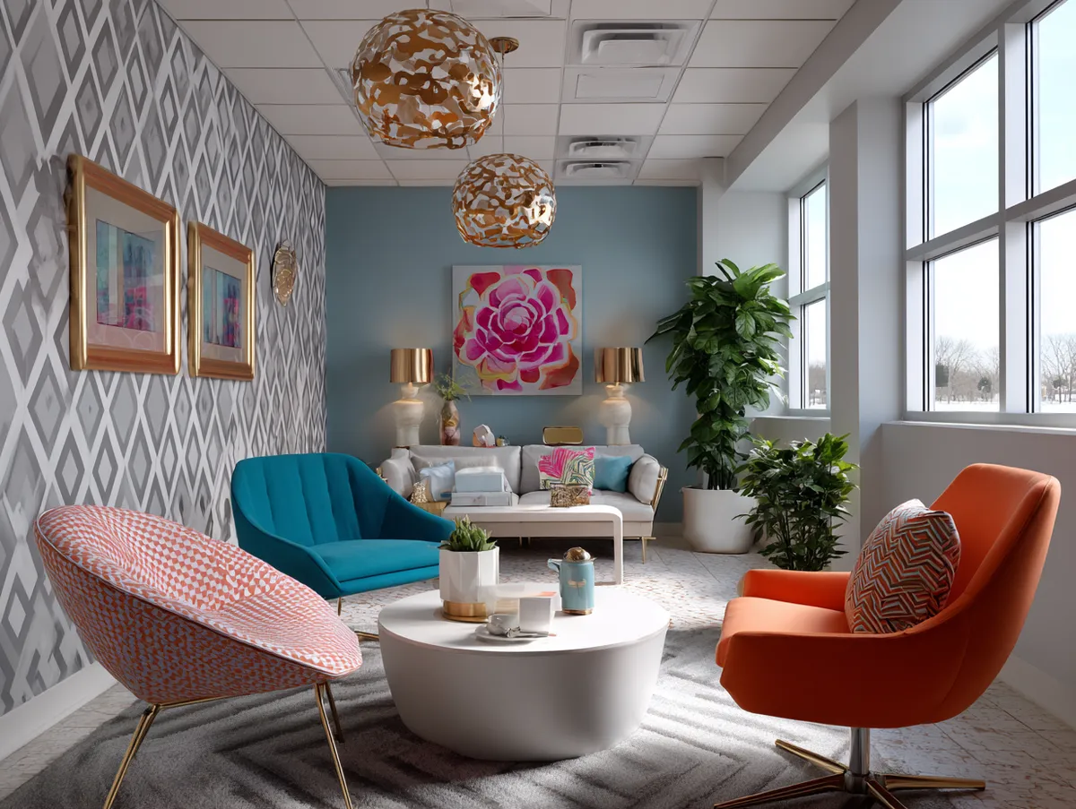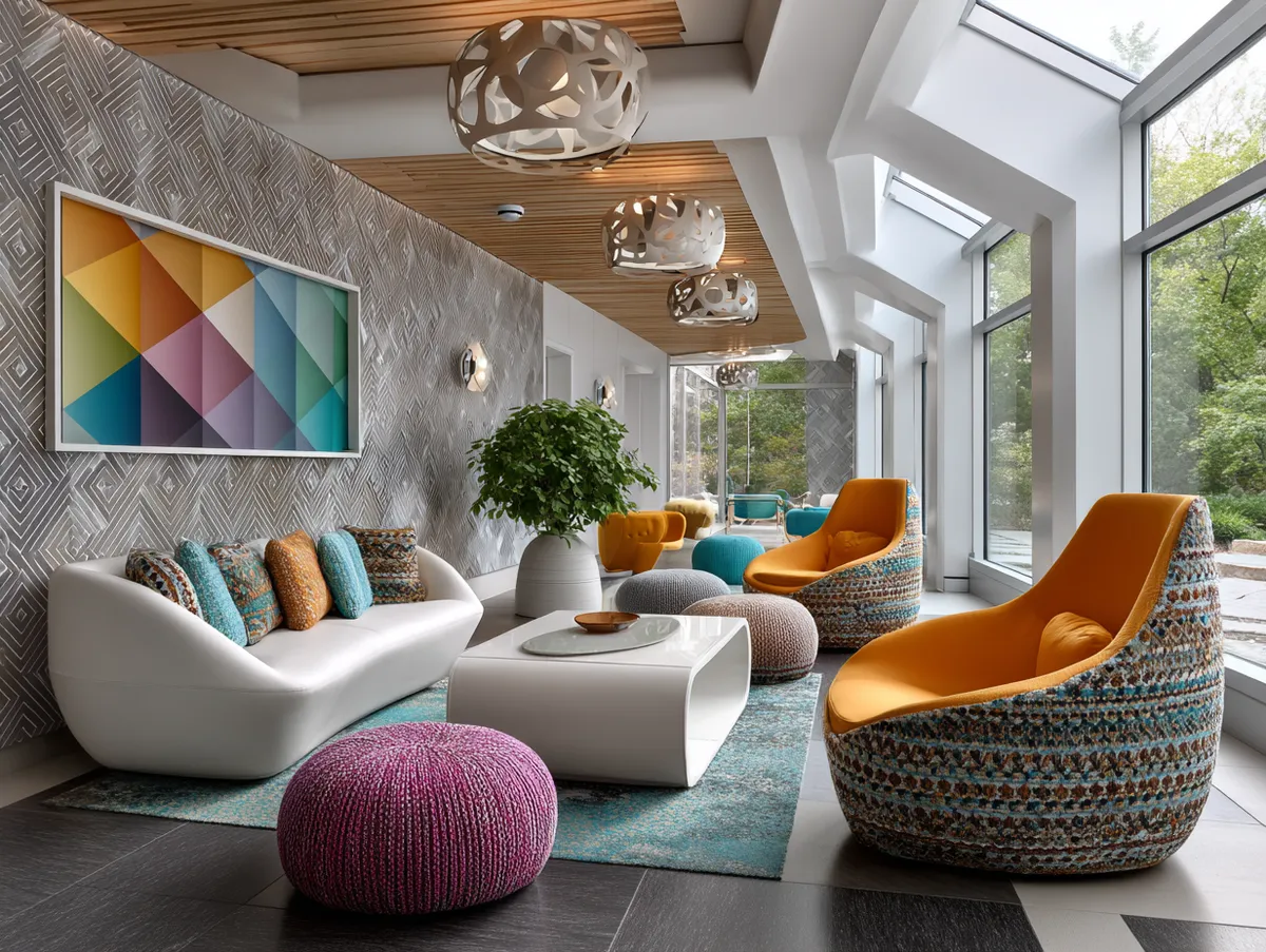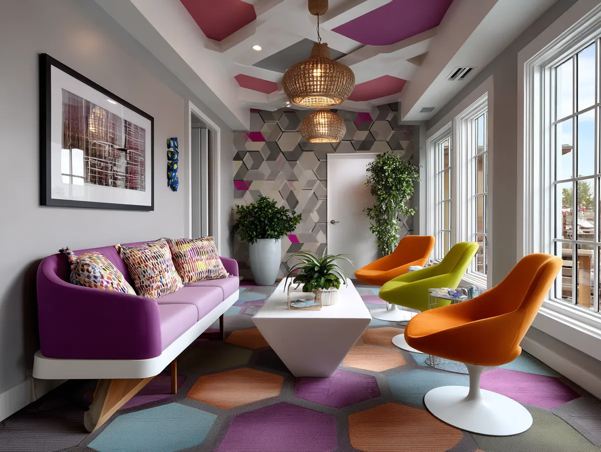 A spacious window on one side of the room allows natural light to flood in, enhancing the vibrancy of the geometric patterns and colors. The window is dressed with minimalist blinds that, when opened, allow the room to seamlessly blend with the exterior, adding a sense of expanded space.