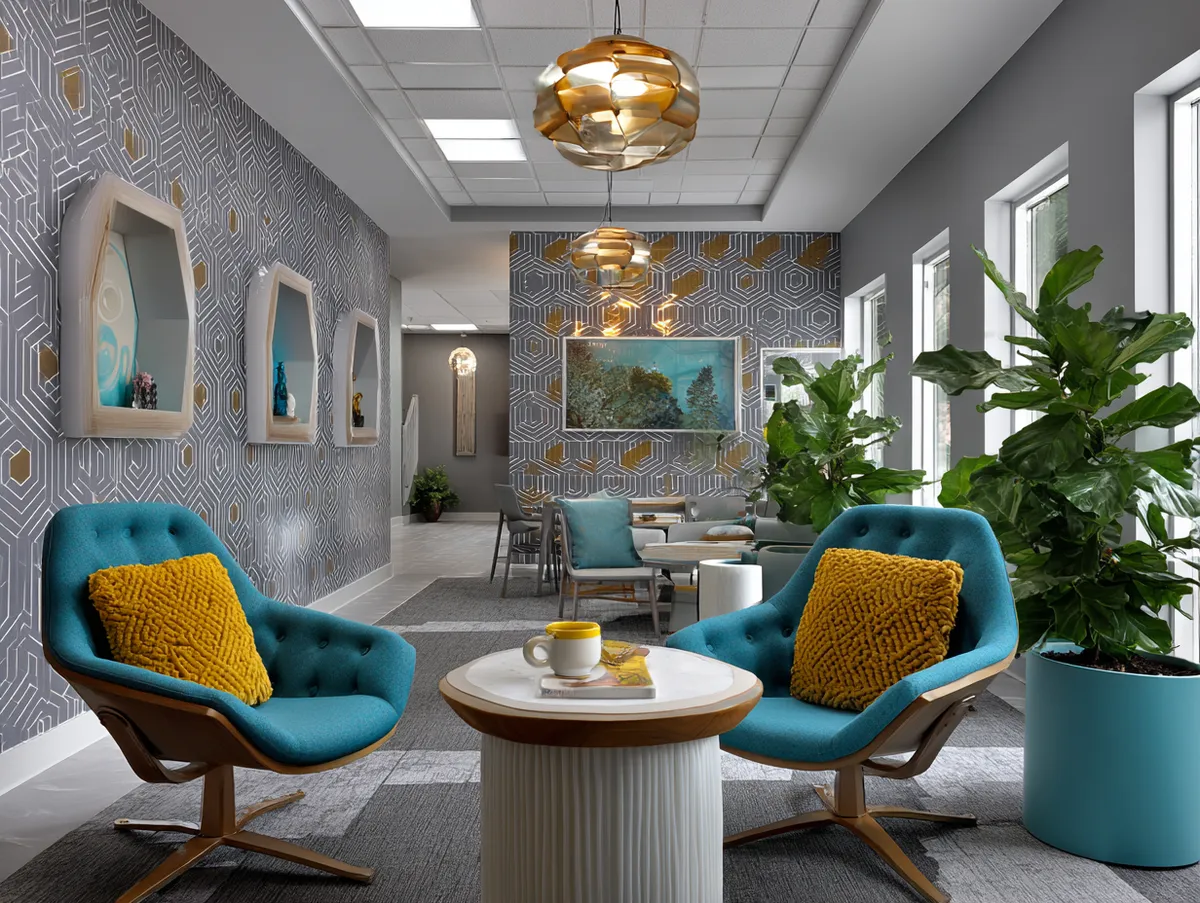 The image portrays a multi-purpose room brimming with geometric designs that serve as a testament to the limitless possibilities of interior styling. The focal point is a statement wall adorned with geometric wallpaper. The wallpaper’s repeating patterns in shades of teal, grey, and white create a dynamic and engaging backdrop for the room.