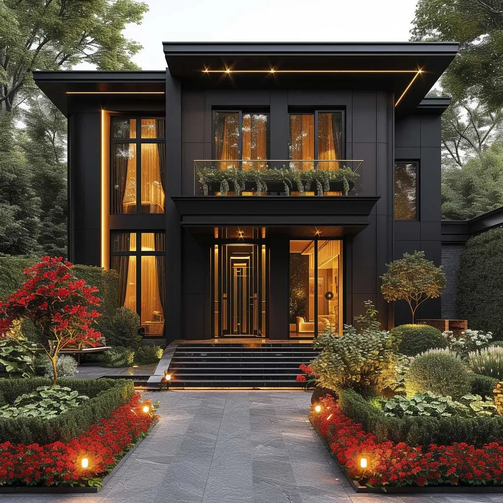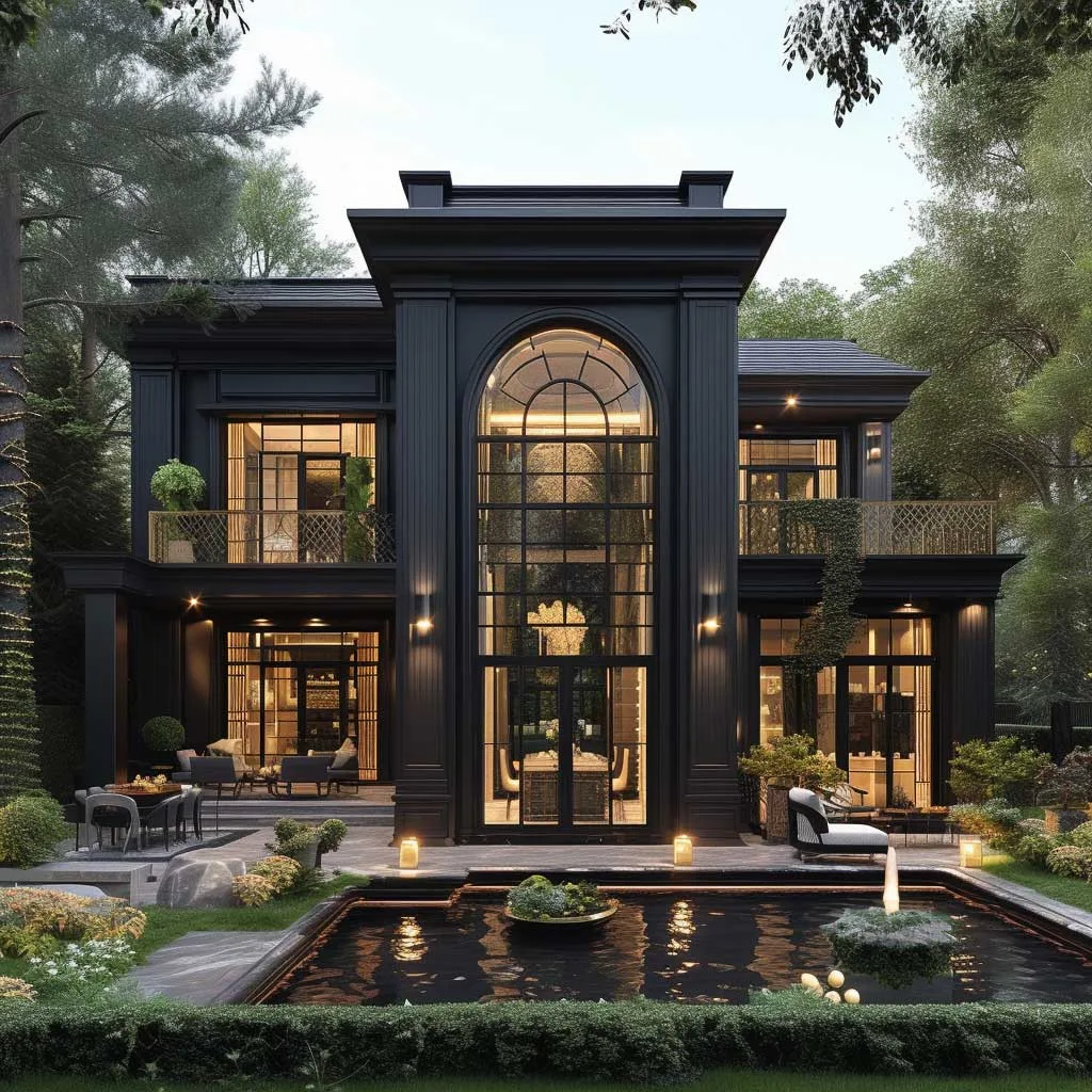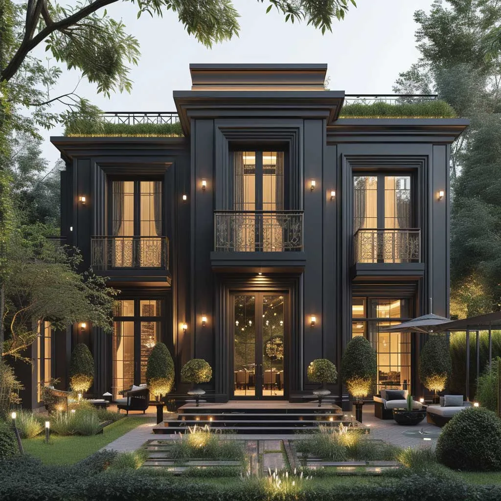 The marriage of champagne gold and ebony in the exterior design of a home brings forth an elegance that is both bold and refined. This color combination, when applied thoughtfully, can transform a house into a striking piece of architectural art. The deep, rich ebony serves as a perfect backdrop, allowing the shimmering tones of champagne gold to stand out, offering a visual feast that is both inviting and impressive.