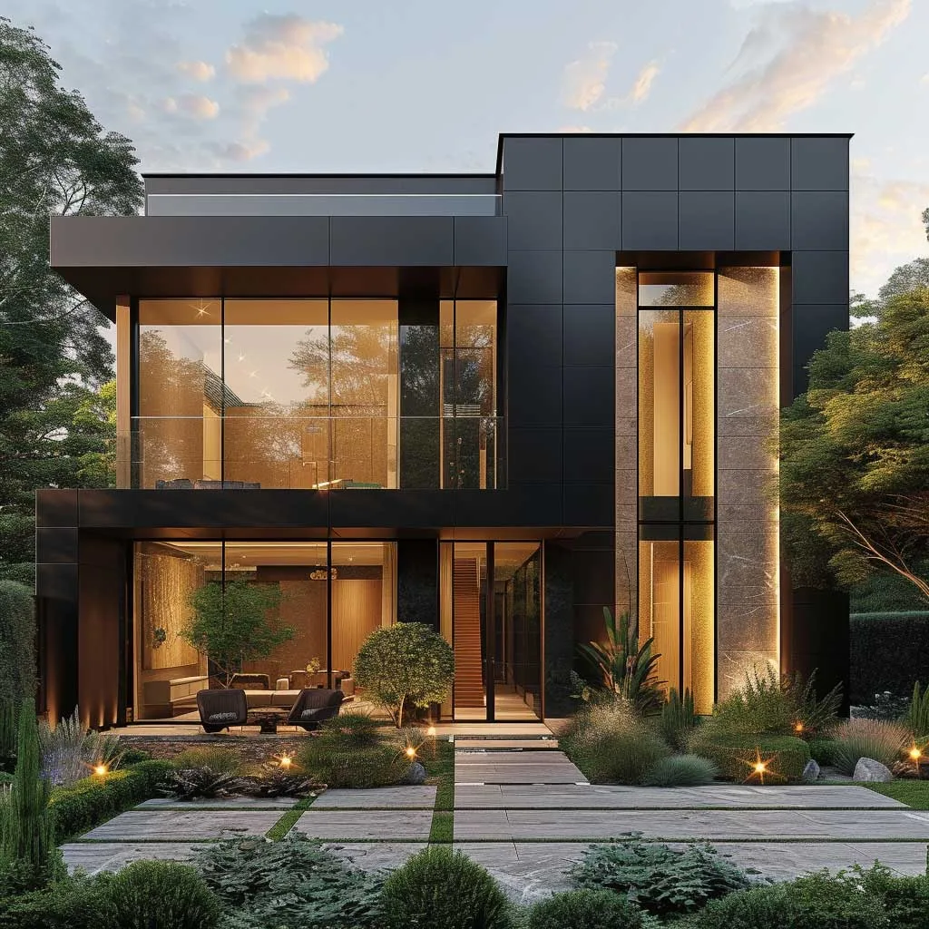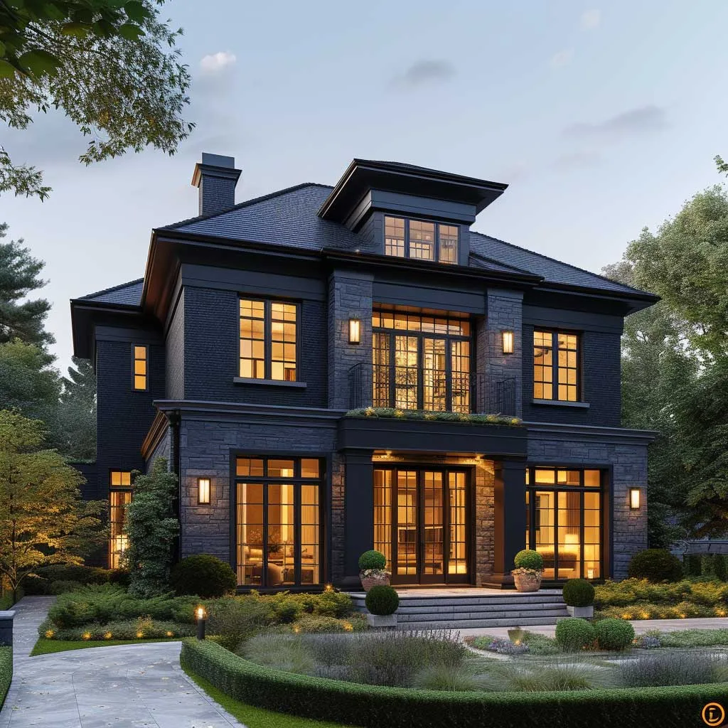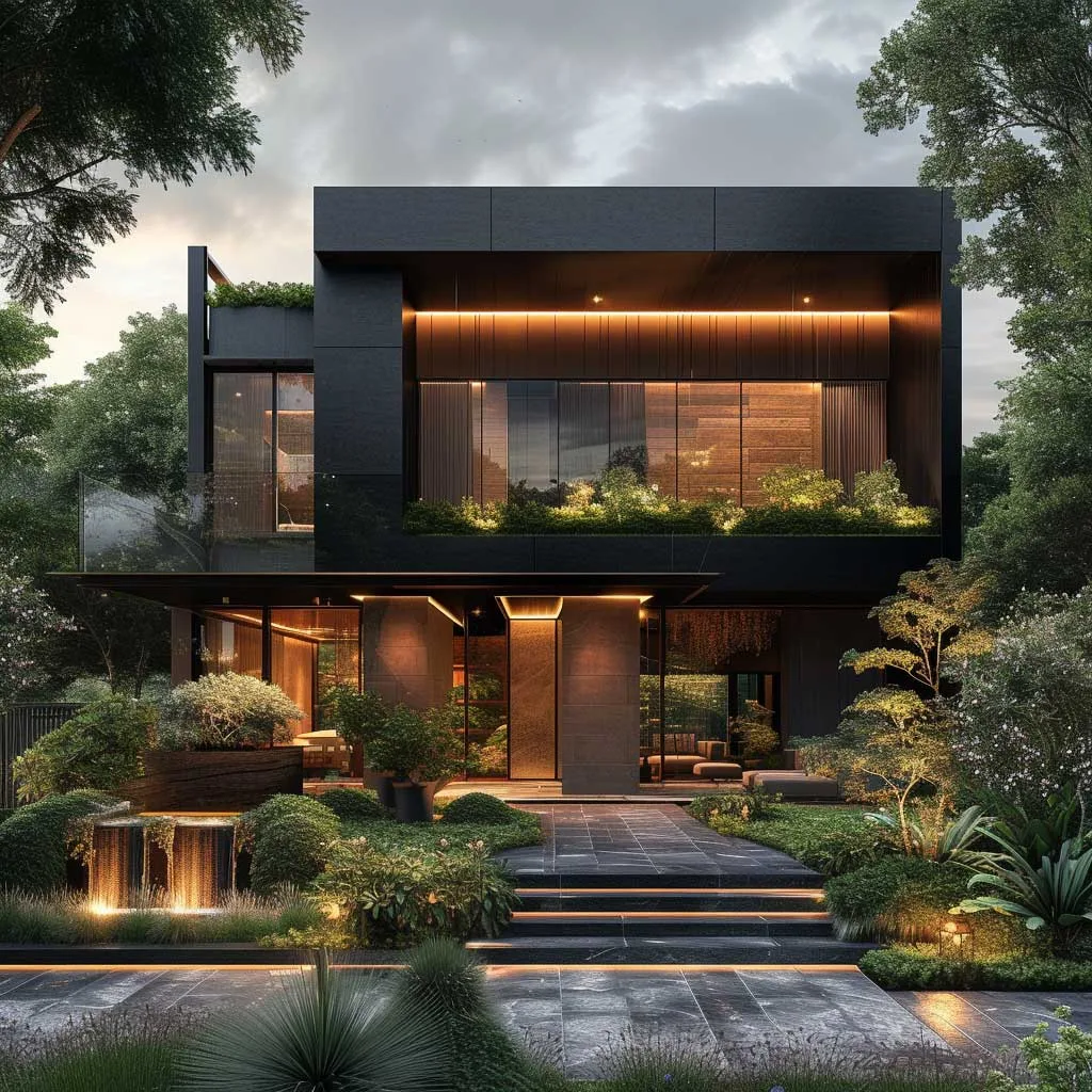 The marriage of champagne gold and ebony in the exterior design of a home brings forth an elegance that is both bold and refined. This color combination, when applied thoughtfully, can transform a house into a striking piece of architectural art. The deep, rich ebony serves as a perfect backdrop, allowing the shimmering tones of champagne gold to stand out, offering a visual feast that is both inviting and impressive.