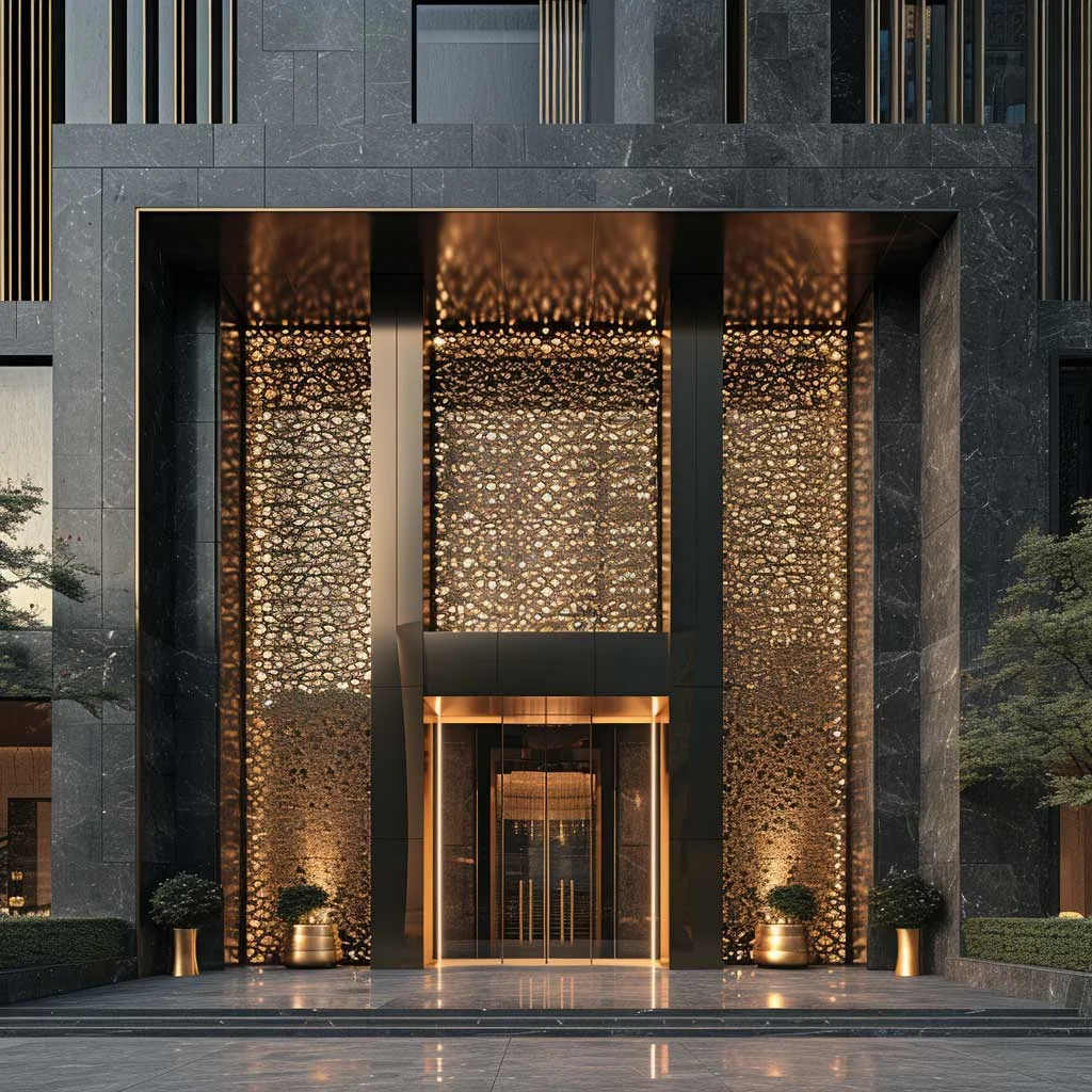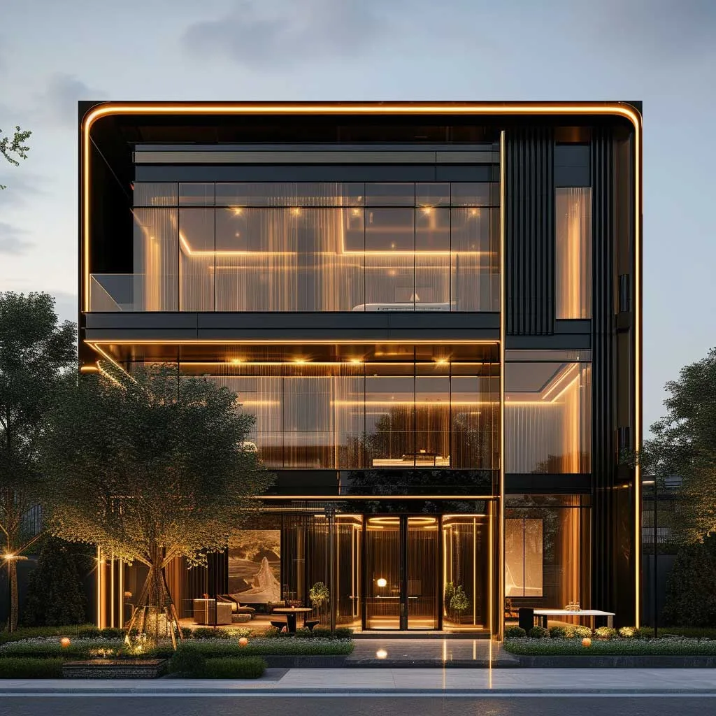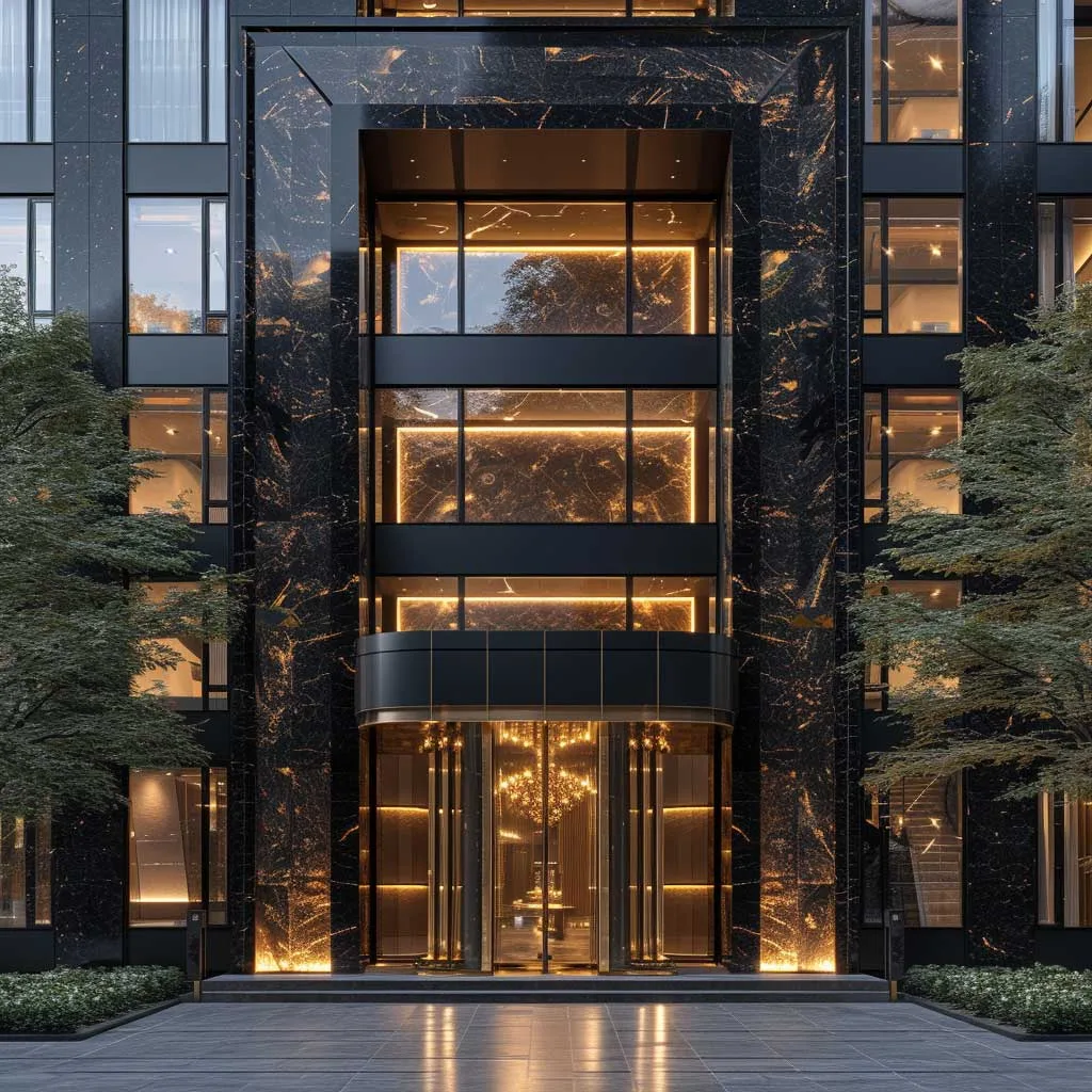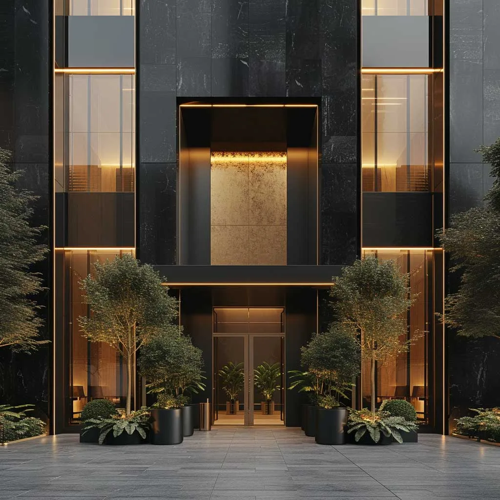 The use of champagne gold in the building’s exterior is a strategic choice that elevates its overall look. These accents, whether in the form of gold-tinted windows, gold-framed entrances, or signage, introduce a sense of luxury and exclusivity. The gold elements catch the light, creating a striking contrast against the ebony background. This interplay of colors not only enhances the building’s architectural details but also makes it more inviting and accessible.