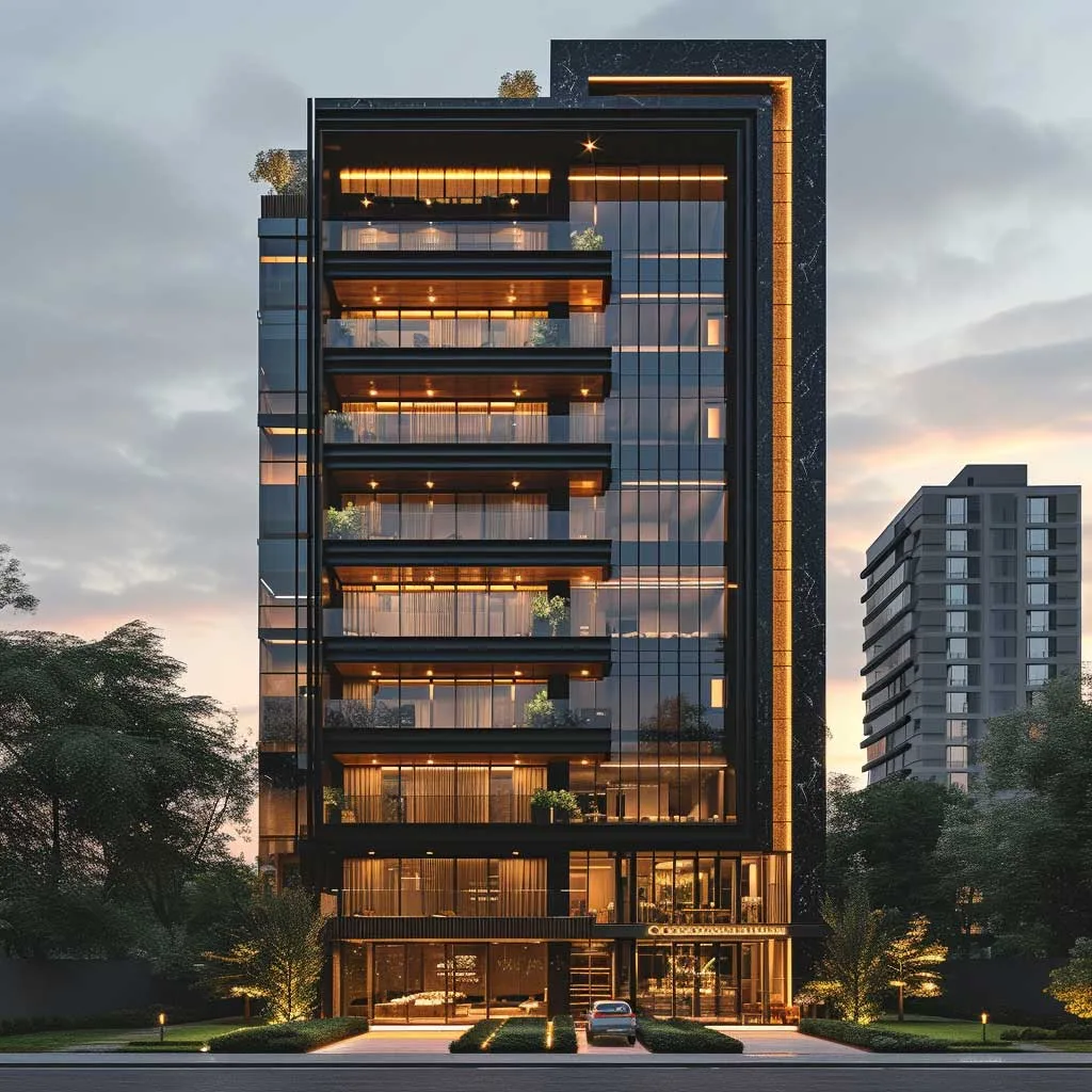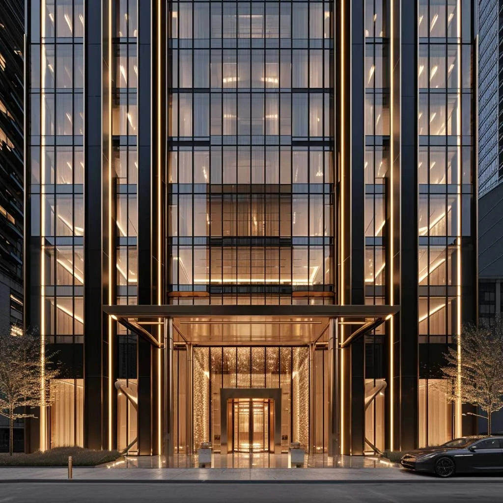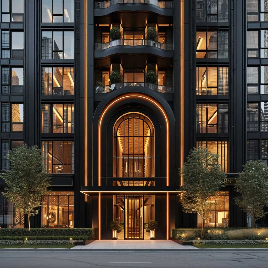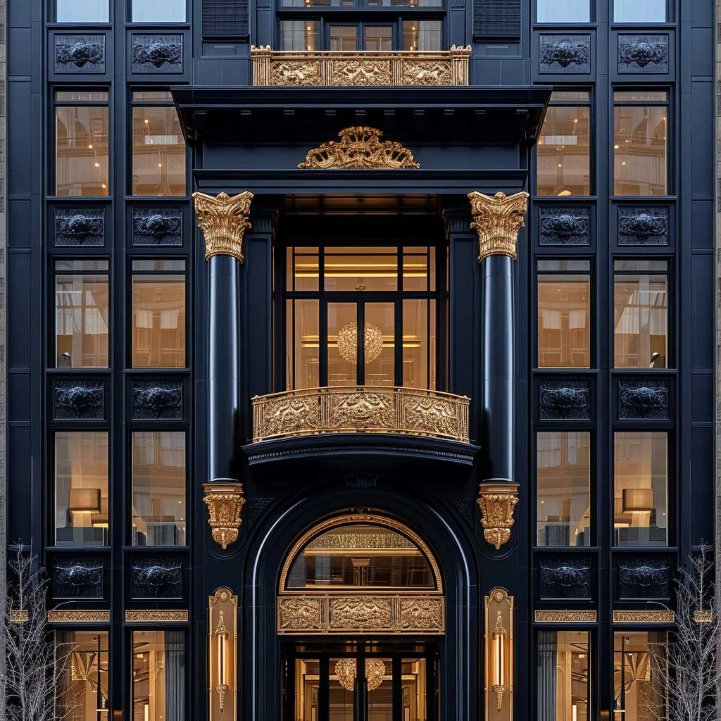 In conclusion, a building with an ebony facade and champagne gold details is a bold choice in urban architecture. It’s a design that speaks of confidence, elegance, and a willingness to stand out. This color combination creates a visual impact that is both commanding and beautiful, making the building a noteworthy addition to any cityscape.