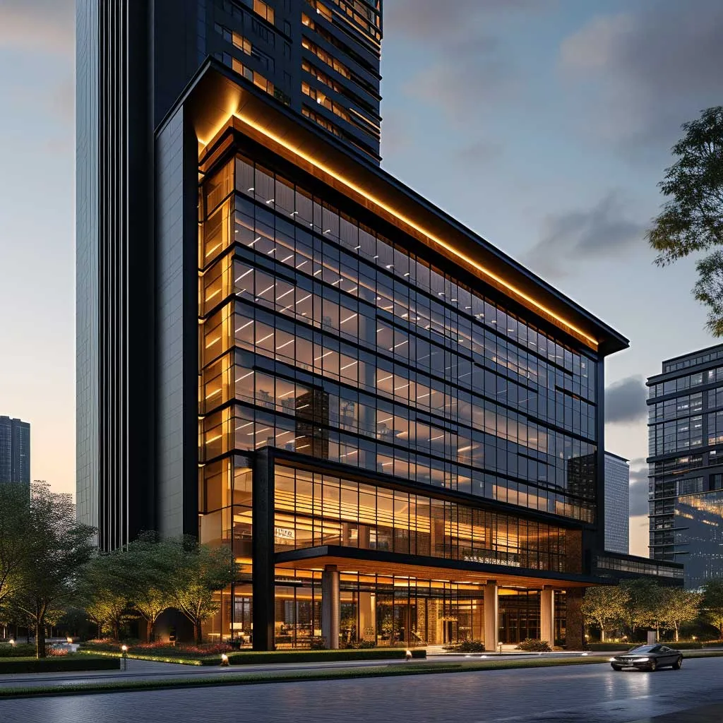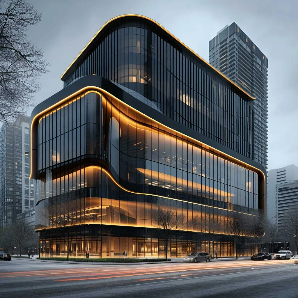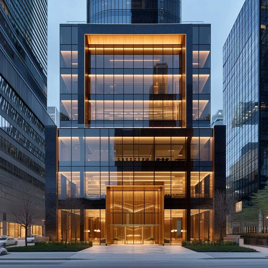 The commercial building’s location within the cityscape further accentuates its distinctive color scheme. Set against the backdrop of a bustling city, the ebony and gold exterior stands out, creating a focal point that draws the eye. At night, the gold accents are illuminated, making the building a beacon of sophistication and style in the urban landscape.