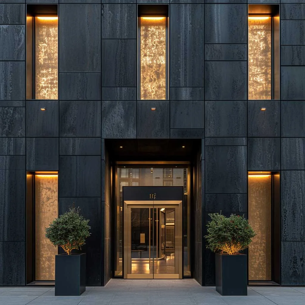 The use of ebony and champagne gold in a building’s facade creates a striking visual statement, embodying both boldness and beauty. This color combination, when applied to the exterior of a building, especially in an urban environment, offers a refreshing contrast to the conventional color palettes commonly seen in city architecture. The ebony serves as a powerful and commanding presence, while the champagne gold adds a touch of sophistication and flair.