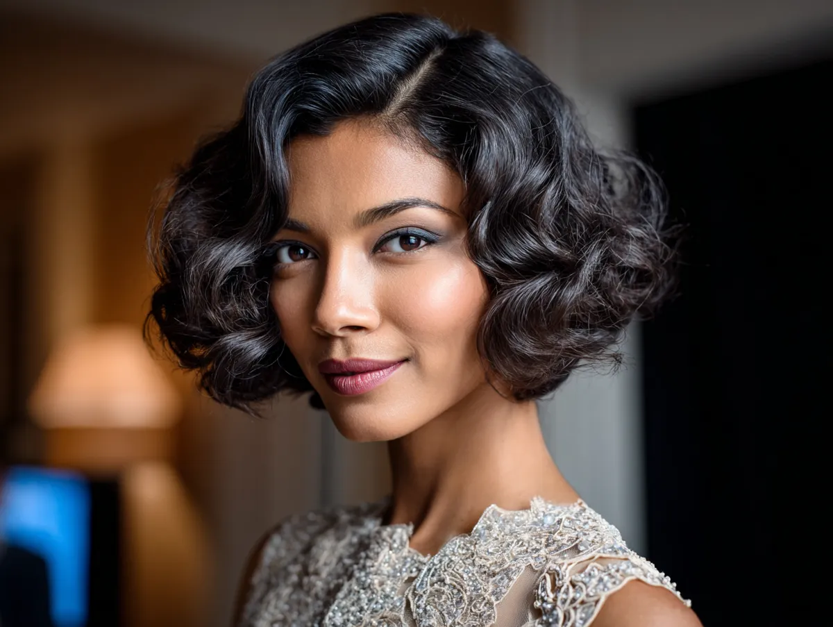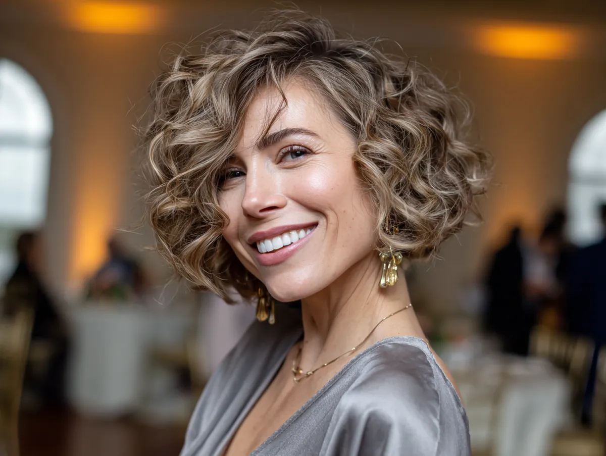Wearing this haircut styled with curls also works beautifully with different types of attire, from evening gowns to cocktail dresses. It allows jewelry like earrings to remain visible, as the hair sits elegantly above the neckline. The layered cut ensures the curls don’t weigh down, keeping the look fresh throughout long hours of celebration.