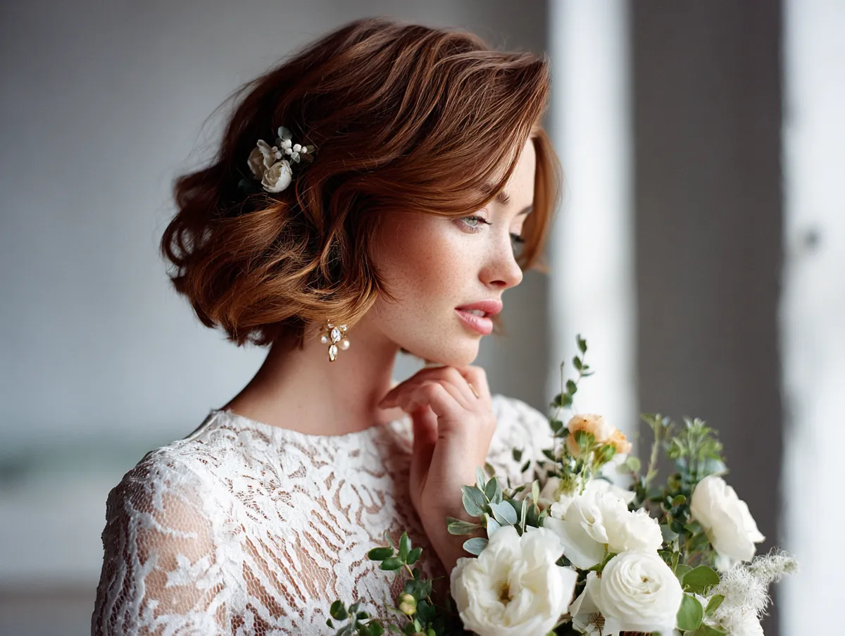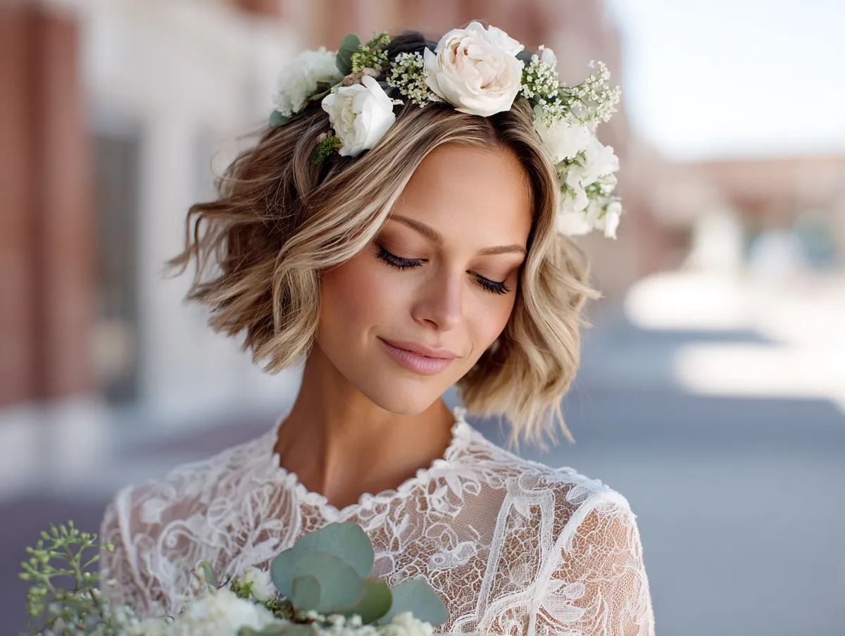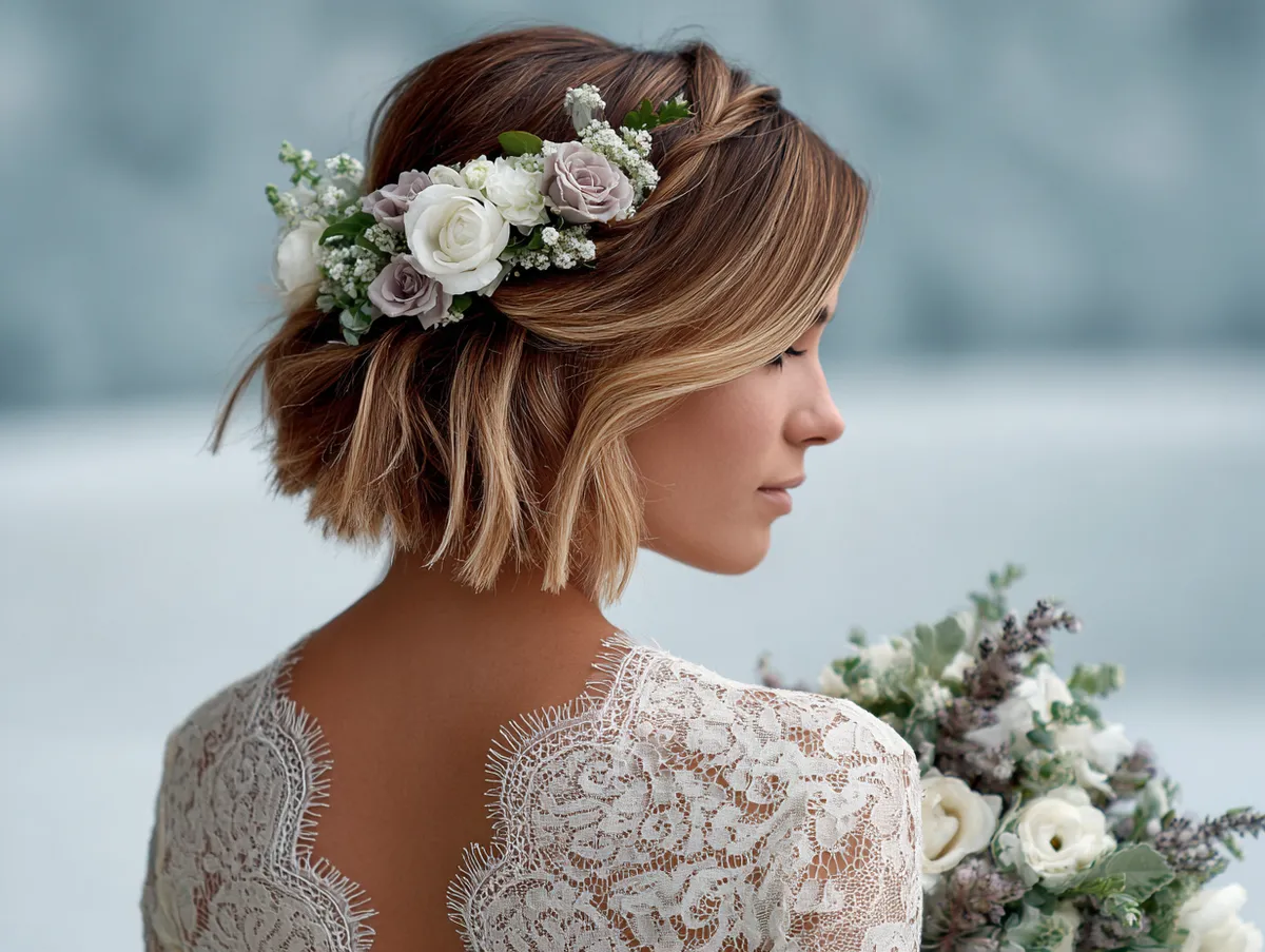 Graduated bob haircut with floral accents for brides