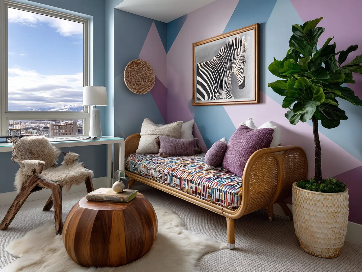 The room strikes a balance between stimulation and relaxation. The energetic geometric patterns are offset by calming elements such as plush textiles and soft tones in other decor pieces, ensuring that the space isn’t overwhelming but instead encourages a range of creative activities.