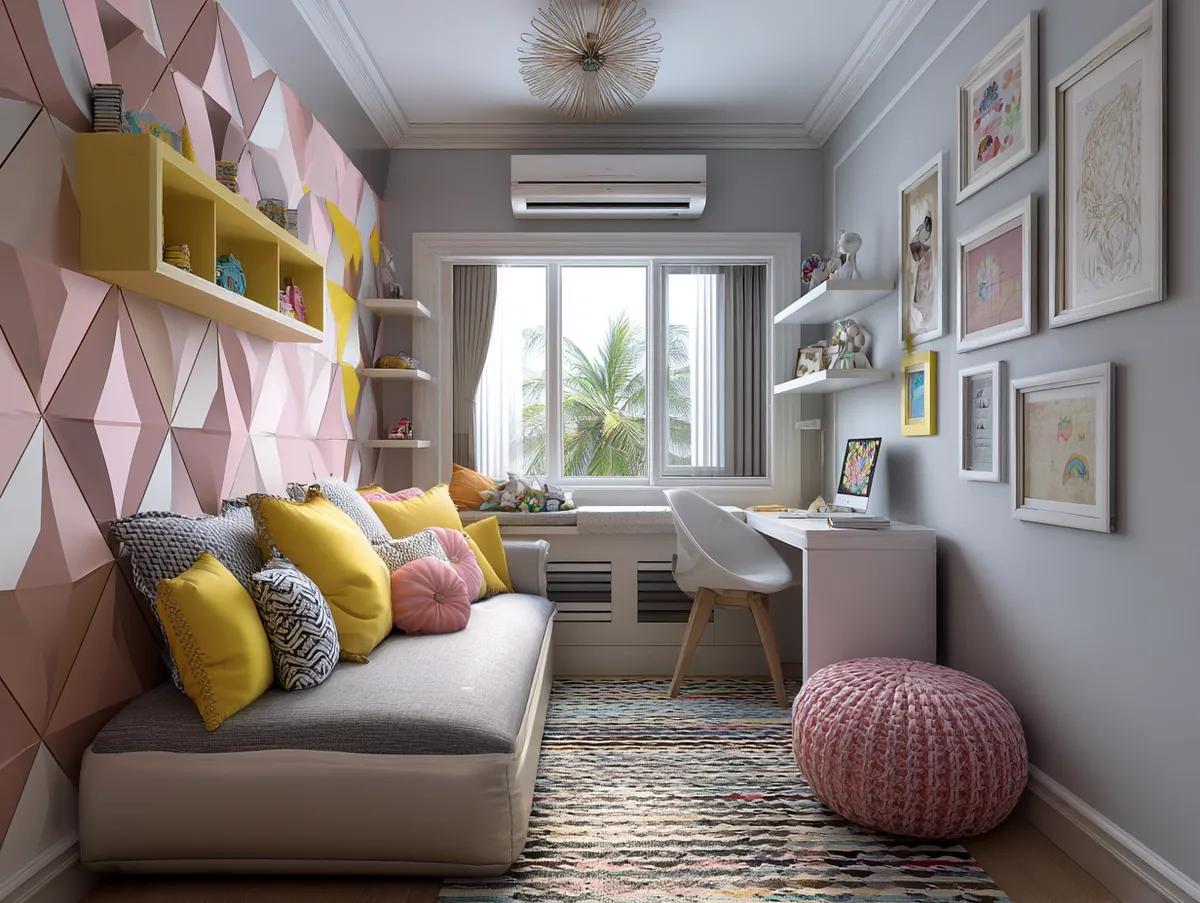 Artfully arranged on the walls, alongside the geometric wallpaper, are various creative artworks. These pieces reflect the color scheme of the room, enhancing the energy and creating a cohesive, visually appealing space for kids to explore their imagination.