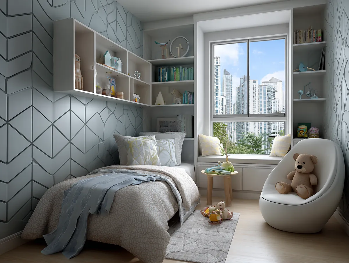Natural light floods the room, emphasizing the geometric patterns on the wallpaper and lending a sense of spaciousness. The room’s large windows allow for abundant daylight, creating a bright and cheerful atmosphere that kids would love to spend time in.