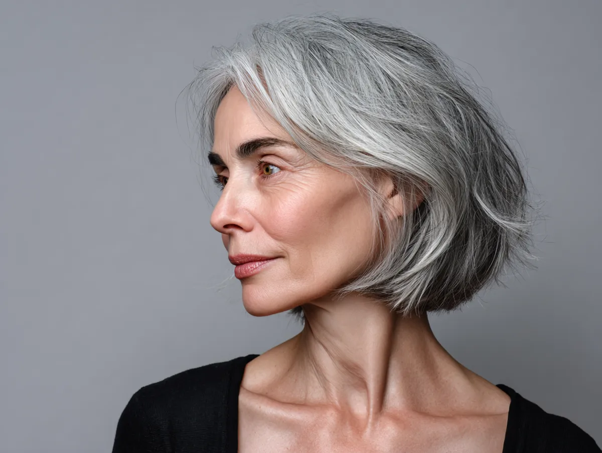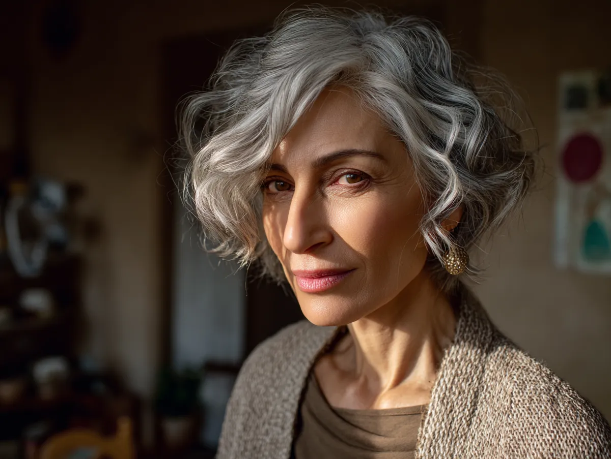 The magic of this hairstyle lies in its structure. A layered bob cut works beautifully with the natural silver and gray tones that develop in mature hair. The interplay of light across each strand adds depth, creating a luminous effect that looks refined from every angle. With gray short hair styles like this, the emphasis is on shape and simplicity rather than daily styling effort. A gentle blow-dry or even air-drying can bring out the natural flow.