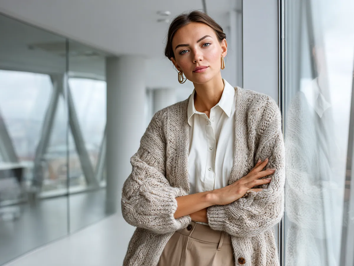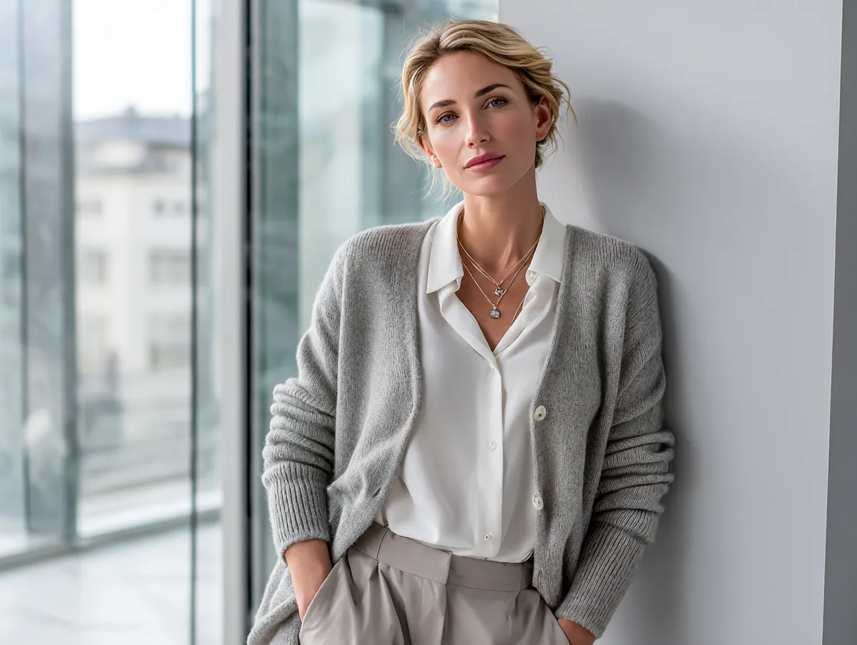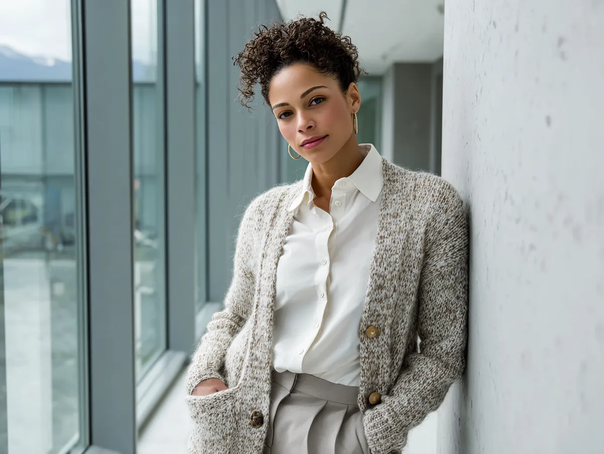 Start by layering a soft cardigan over a crisp white blouse or a silk camisole. Combine it with structured dress pants and loafers or heeled ankle boots. This balance between soft knitwear and tailored fabrics creates a harmonious professional appearance—warm, stylish, and understated. When accessorizing, choose minimalistic jewelry such as gold hoops or a simple watch to keep the focus on clean lines.