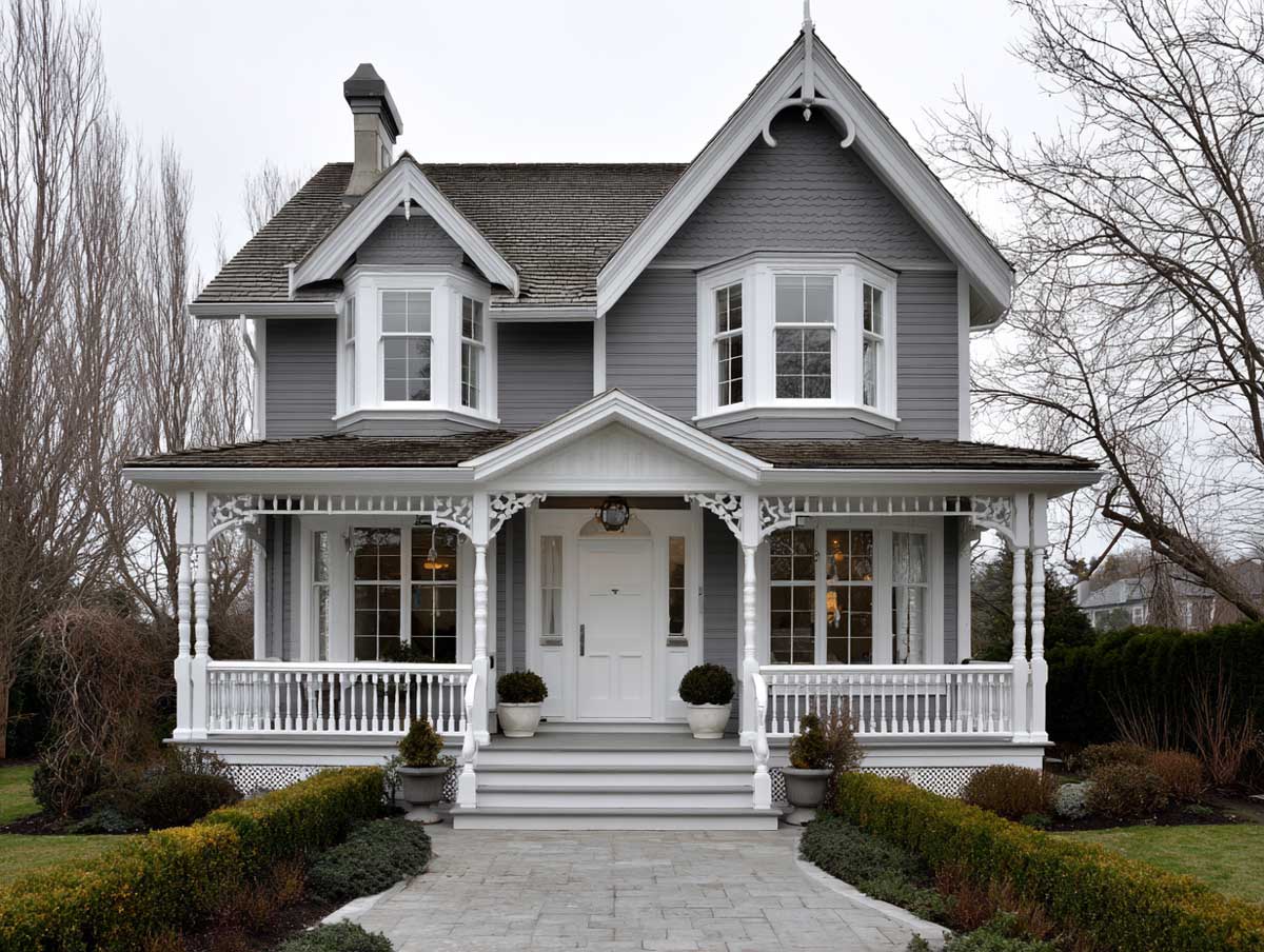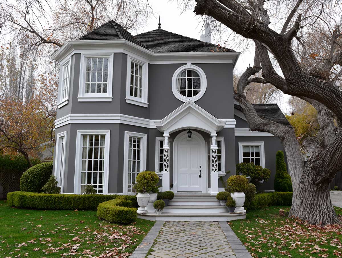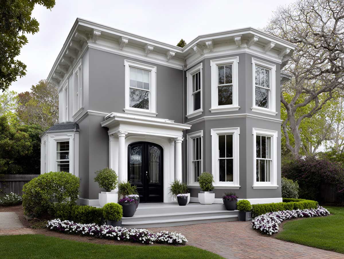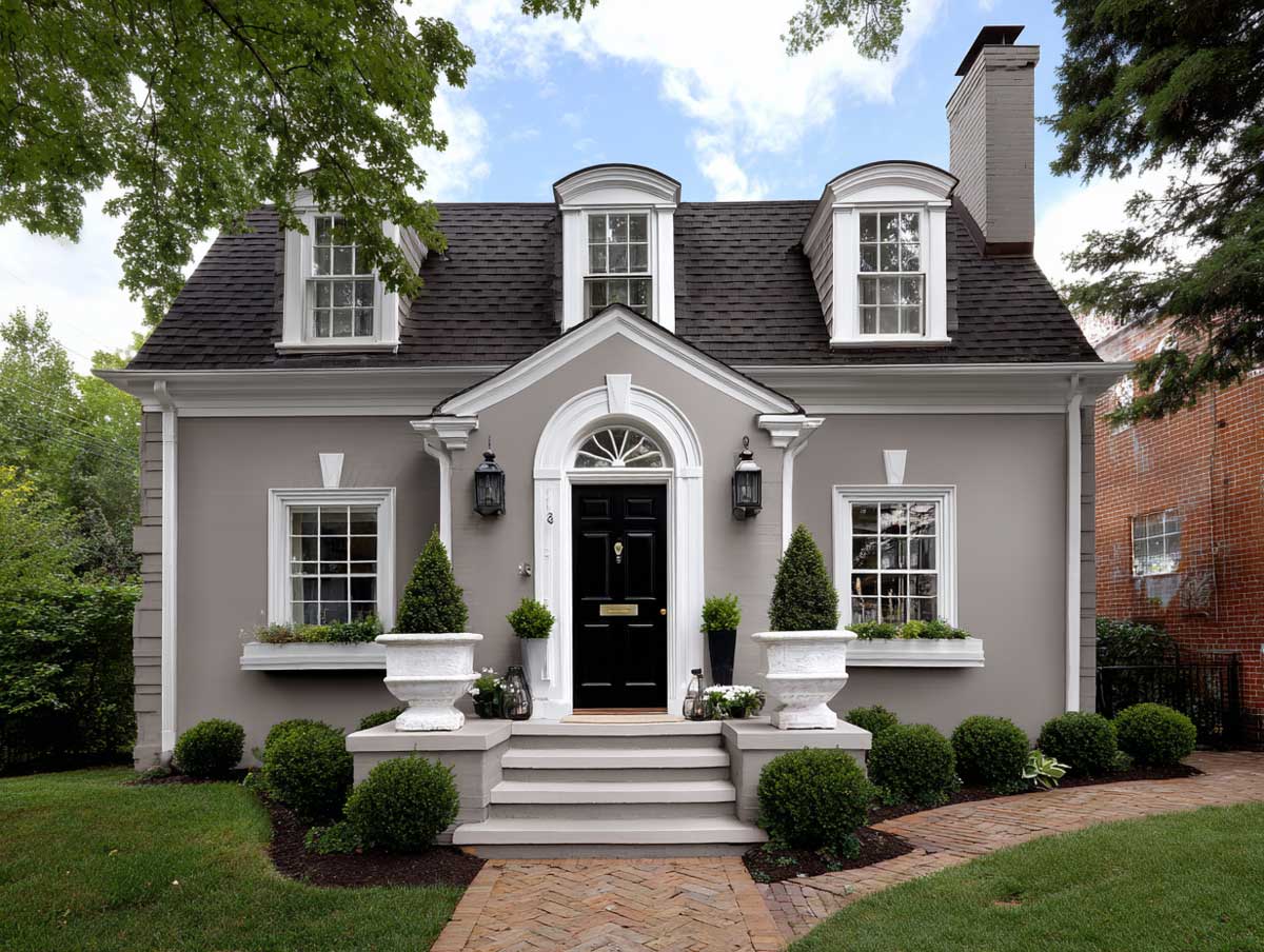 Choose a shade of grey that complements the crisp white trim and dramatic black shutters, balancing the overall color palette. Consider incorporating various grey tones to add depth and dimension to your exterior design.