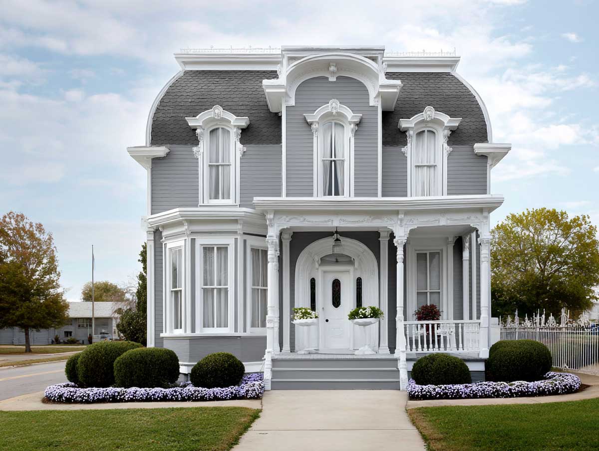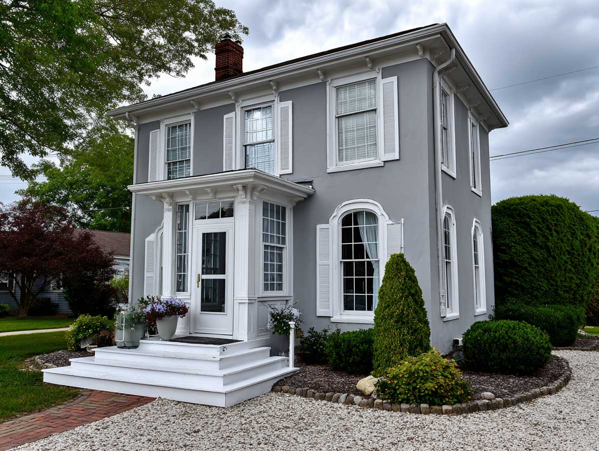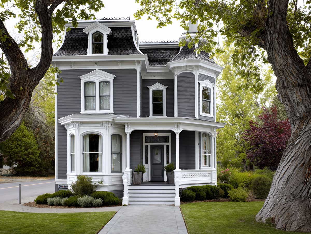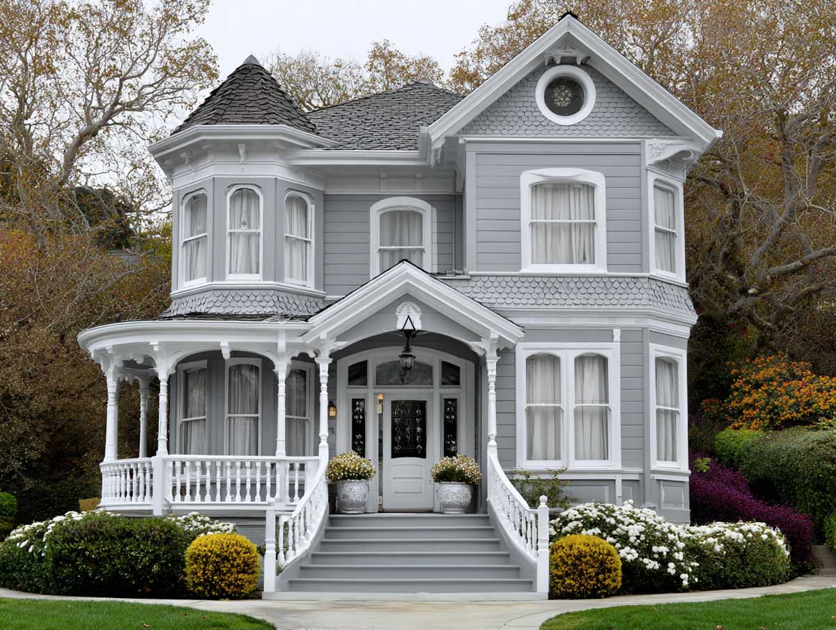 Choose a shade of grey that complements the crisp white trim and dramatic black shutters, balancing the overall color palette. Consider incorporating various grey tones to add depth and dimension to your exterior design.