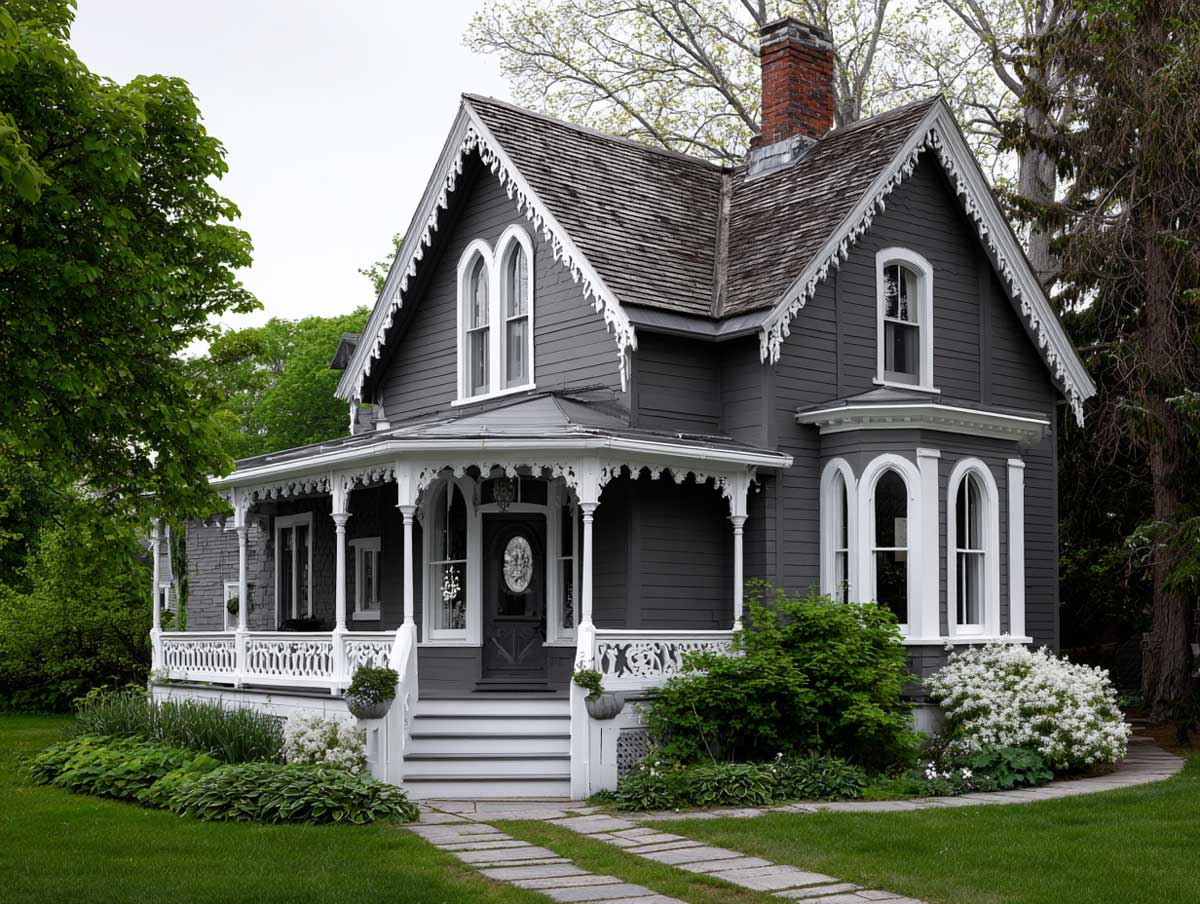 A dark gray house with white trim exudes sophistication and elegance. To accentuate this refined combination, consider using architectural elements, such as columns, ornamental moldings, or decorative cornices, that enhance your home’s unique features.