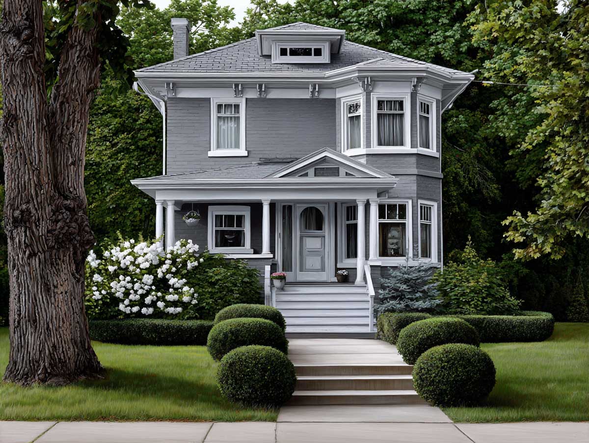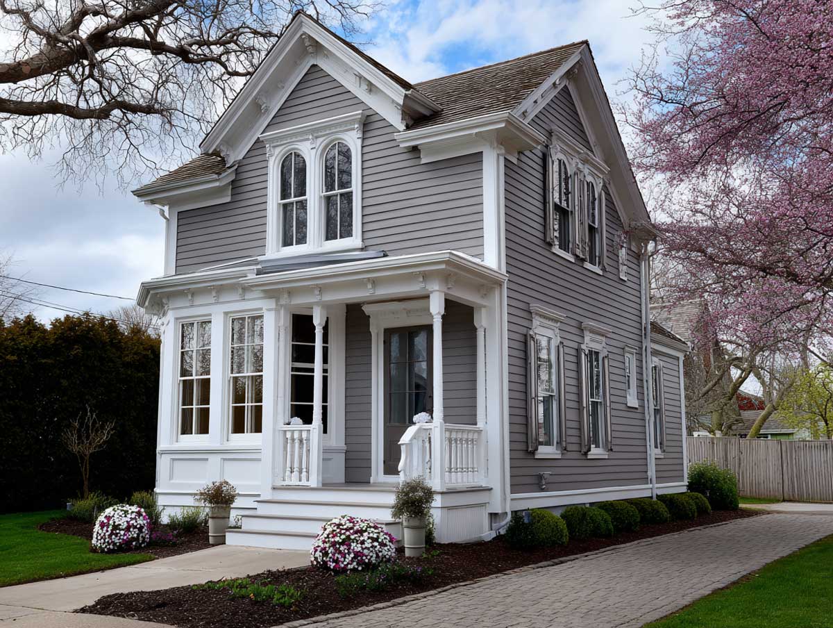 A light grey house with white trim exudes a sense of tranquility and sophistication. To enhance this delicate balance, consider incorporating subtle contrasts in your landscape design, such as colorful flower beds or textured hardscaping elements.