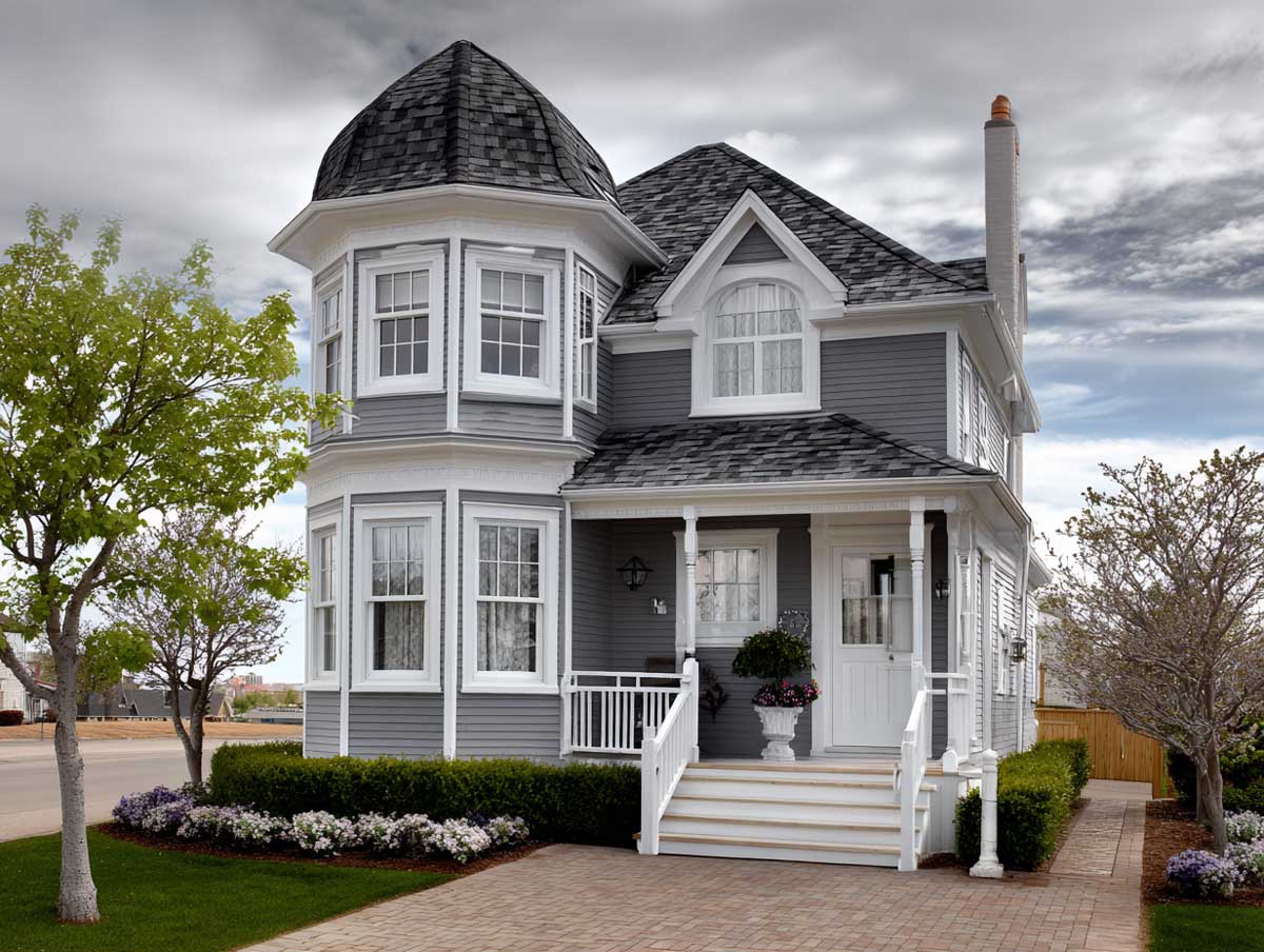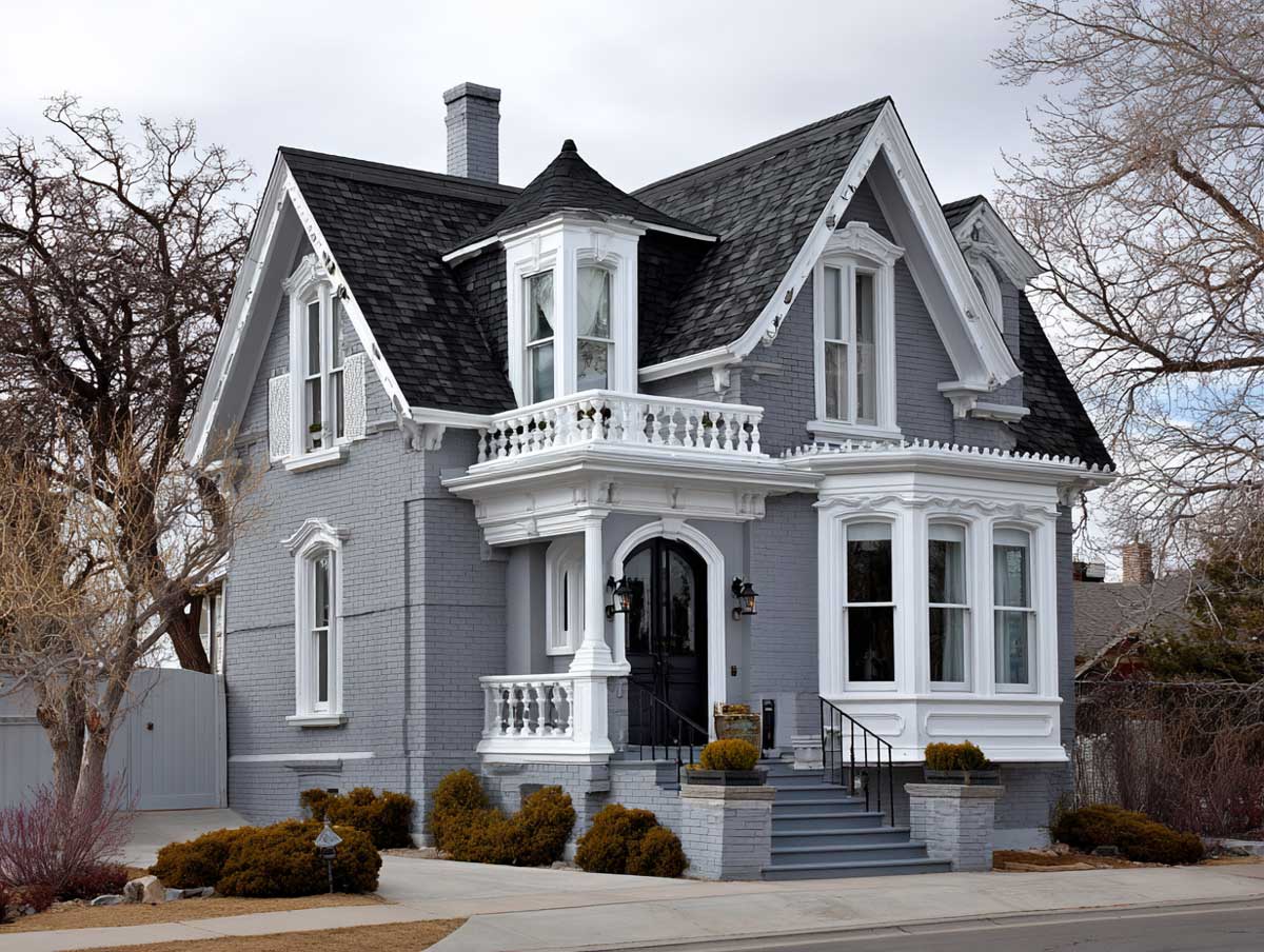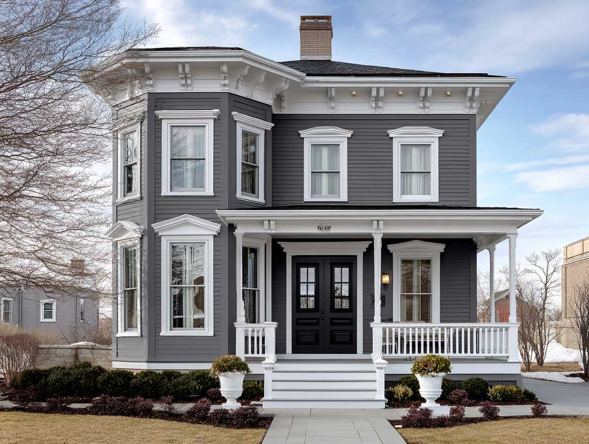 Choose a shade of gray that complements the crisp white trim and dramatic black shutters, balancing the overall color palette. Consider incorporating various gray tones to add depth and dimension to your exterior design.
