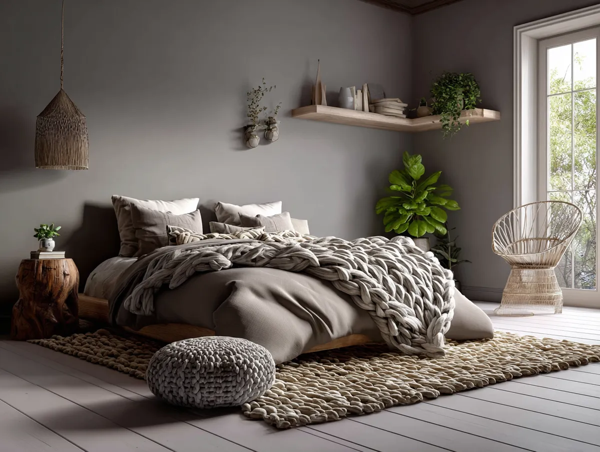 The bed, dressed in high-quality, textured linens in subtle hues, commands attention in the center of the room. Fluffy cushions and a chunky-knit throw add an extra layer of warmth and comfort, demonstrating how textiles can be used to enhance the cozy factor in Scandinavian design.