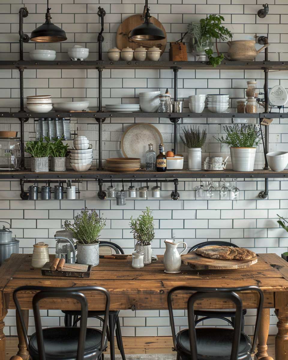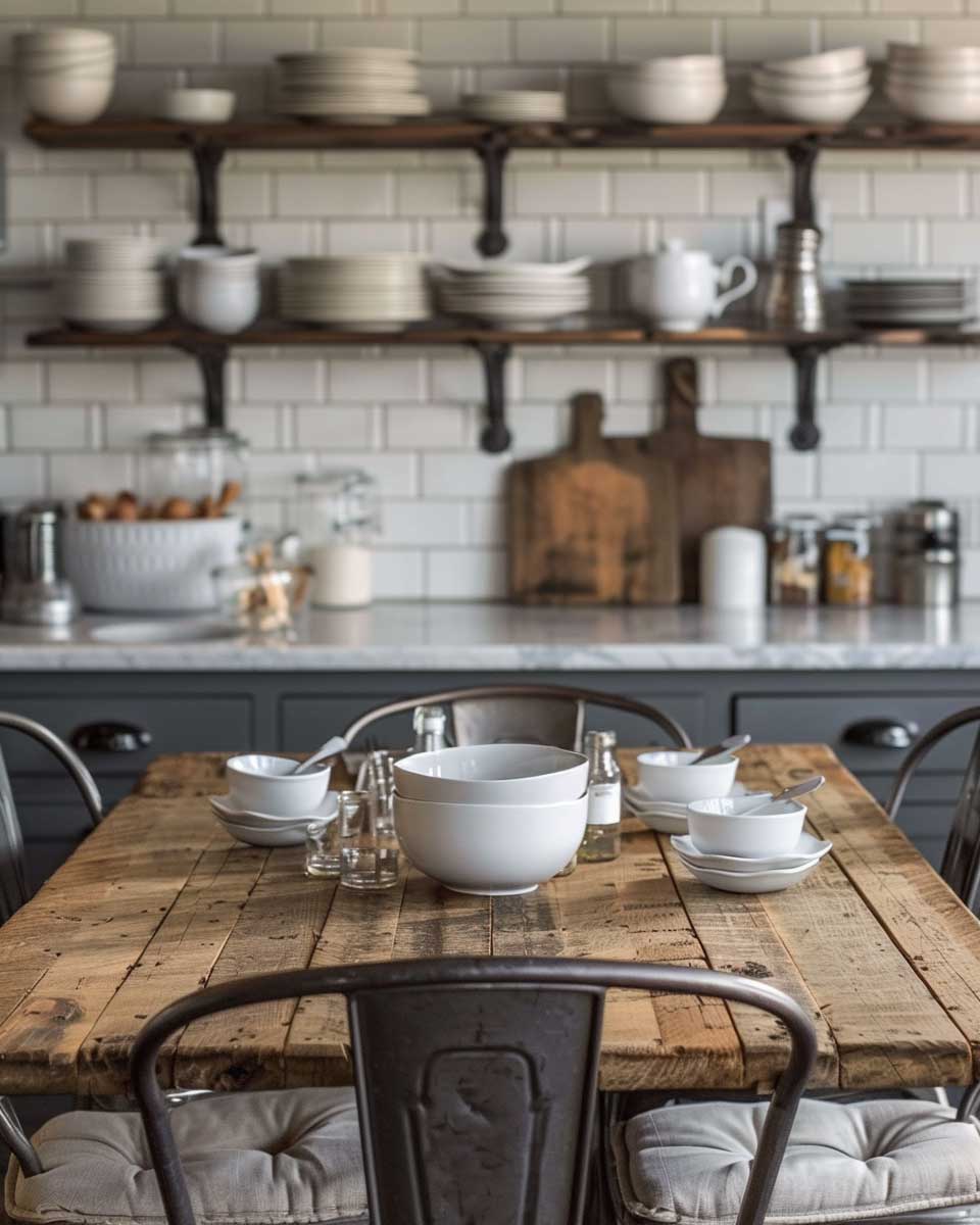 The kitchen, often referred to as the heart of the home, provides a perfect canvas for industrial farmhouse style. Here, the utilitarian meets the homely in the most seamless manner. Open shelving crafted from reclaimed wood and metal pipes showcases rustic dishware against a clean, white subway tile backdrop, striking a balance between openness and organization. This combination not only adds a touch of industrial chic but also encourages a sense of warmth and welcome. The addition of a robust farmhouse table in the dining area, paired with sleek metal bistro chairs, underlines the versatility of this decor style. A vintage industrial chandelier overhead serves as a statement piece, casting a warm glow over meals shared with family and friends.