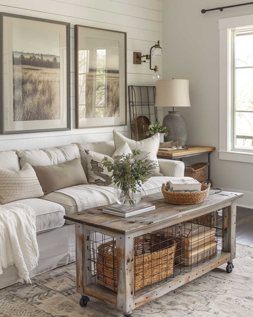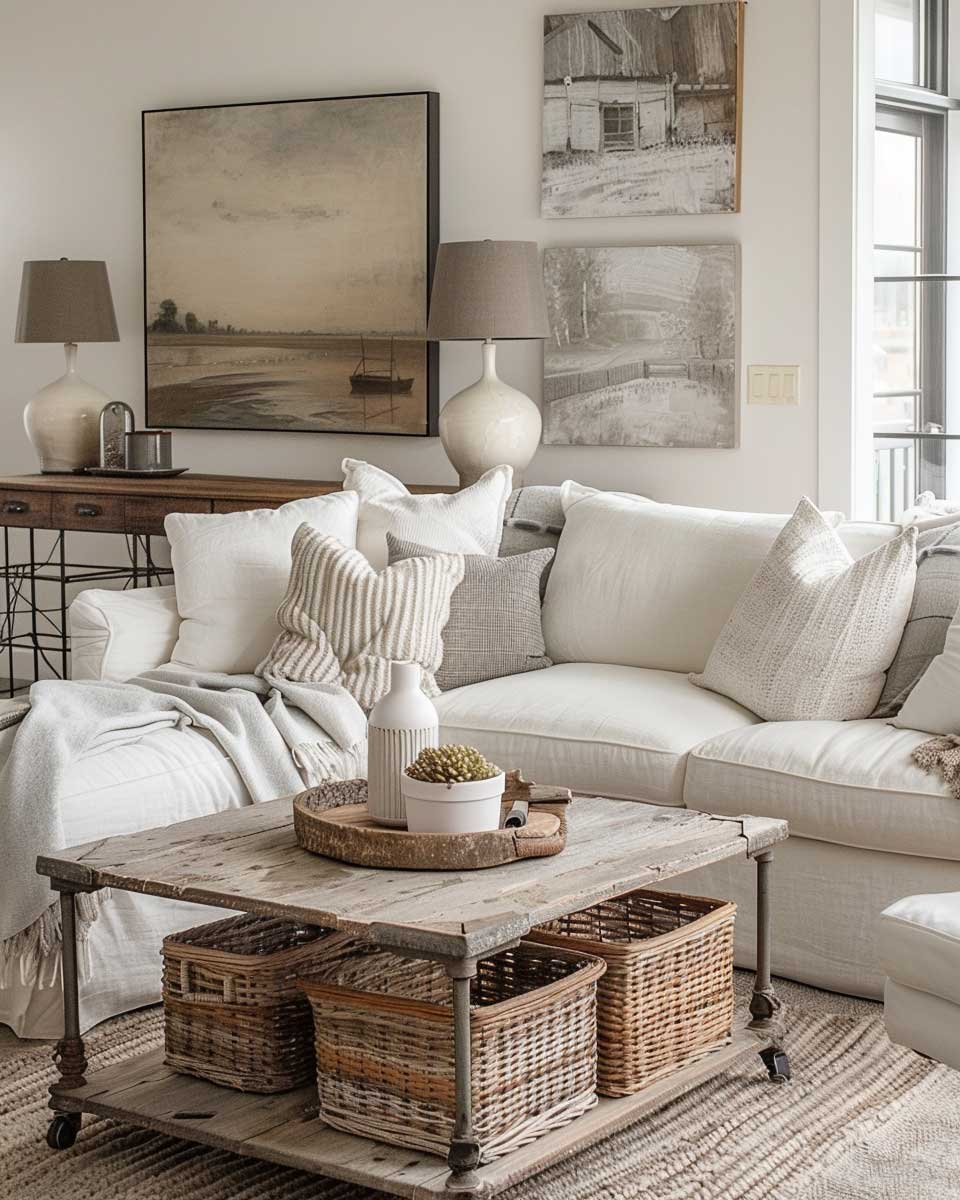 The use of a neutral color palette, featuring shades of soft gray, creamy white, and natural wood, ties the room together, creating a backdrop that allows the industrial and farmhouse elements to shine. This choice of colors enhances the sense of space and light, making the room feel open and airy, yet cozy and grounded.