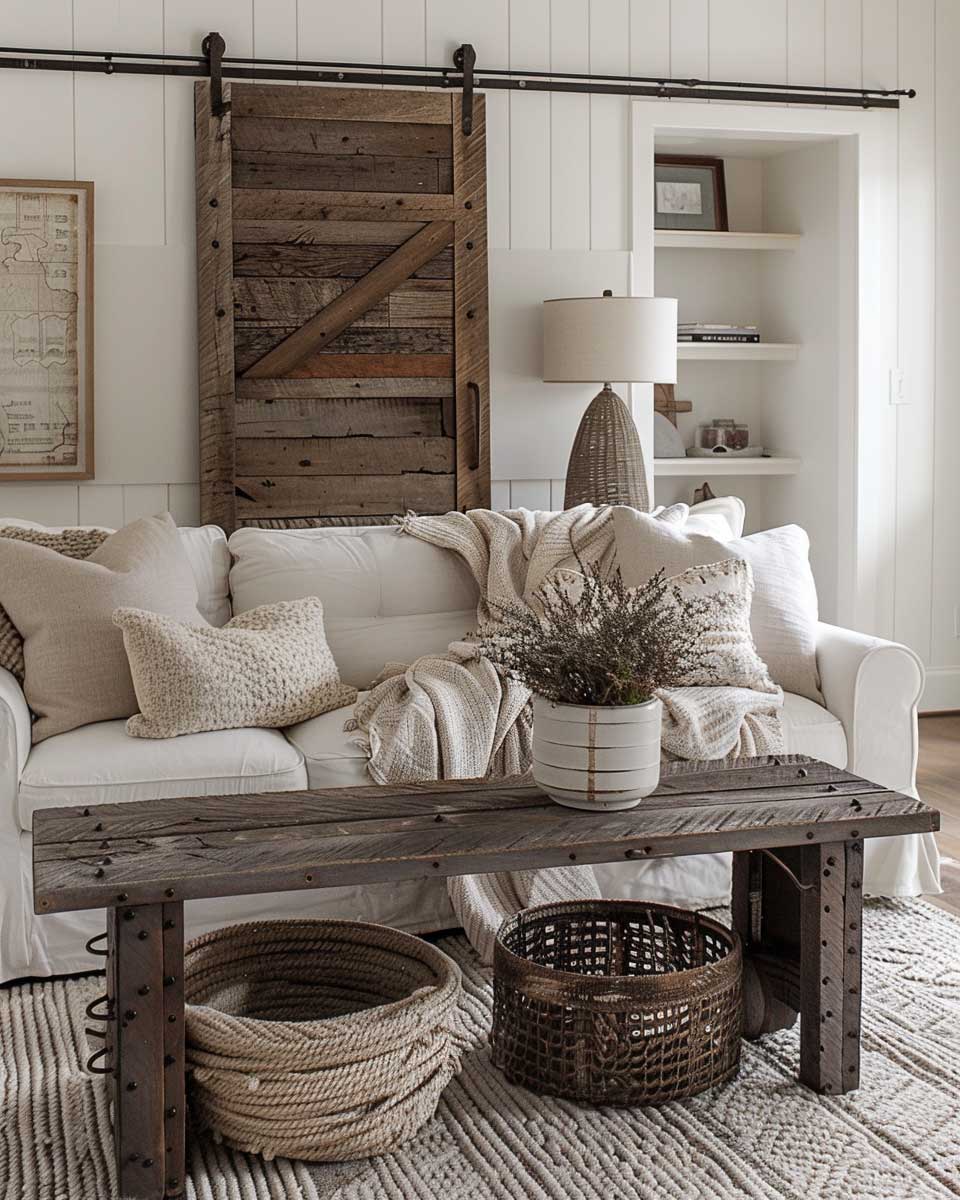 Textural elements are key to achieving a harmonious industrial farmhouse look. Soft, cozy throws draped over the sofa, rugged area rugs underfoot, and the smooth surface of a wood coffee table create a sensory experience that invites relaxation and engagement. The contrast of textures, from the roughness of reclaimed wood to the softness of textiles, enriches the space, making it more dynamic and inviting.