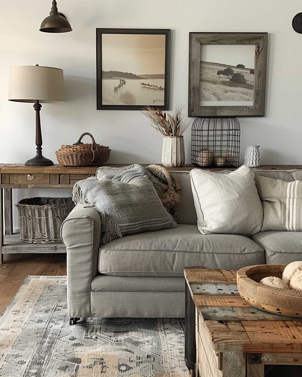 The entryway, as the first impression of the home, sets the tone for what lies beyond. Here, a repurposed wood console table, adorned with metal lamps and wire baskets for clever storage, introduces guests to the industrial farmhouse theme. This welcoming space hints at the aesthetic journey awaiting inside, marrying functionality with style in a way that’s both practical and pleasing to the eye.