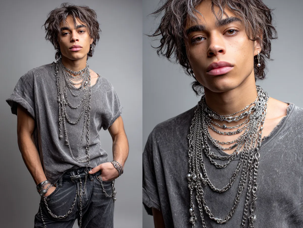 Minimalist emo outfit ideas thrive on intentional choices. Instead of over-accessorizing, focus on proportion and attitude. Two or three chains of different lengths create movement near the neckline, framing the face naturally. Combine this with distressed denim or pleated skirts for variety. Adding fingerless gloves or wristbands can also deepen the look without overwhelming it.