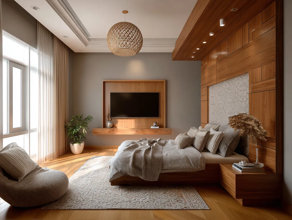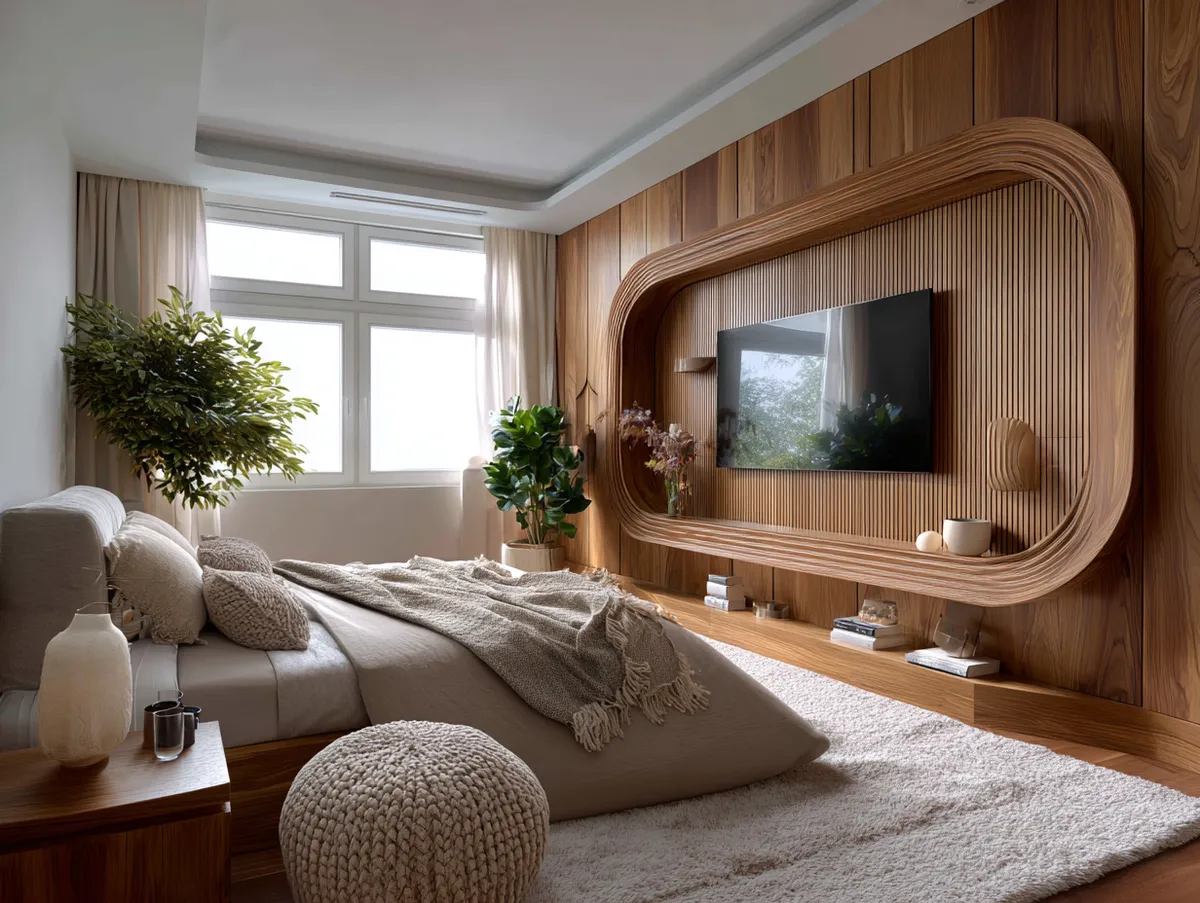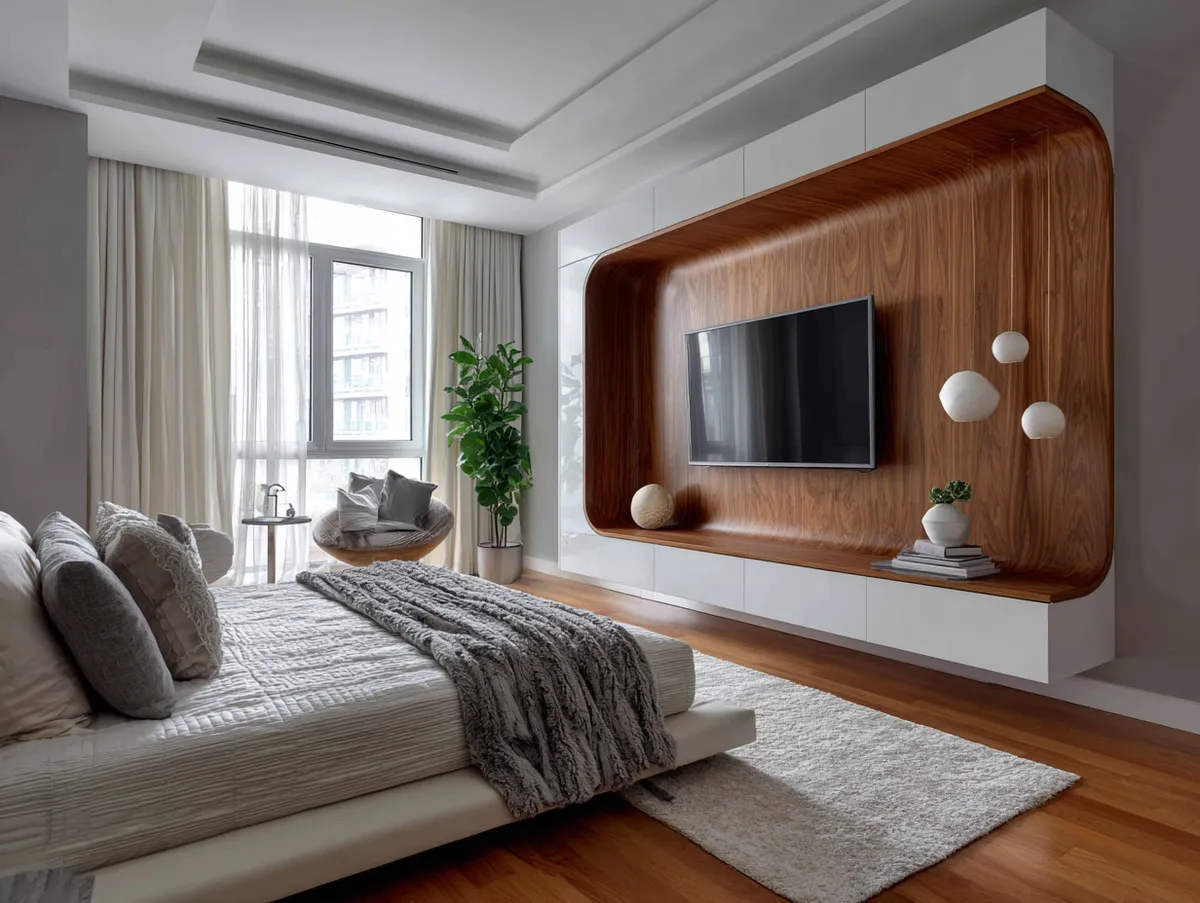 A modern TV panel design in warm wood tones, like the one featured in our example photo, can add a touch of rustic charm to your bedroom. The natural grain and texture of the wood can add depth and dimension to your space, making it feel more inviting. Moreover, a wood TV panel design can blend seamlessly with any decor style, from rustic to modern, making it a versatile choice.