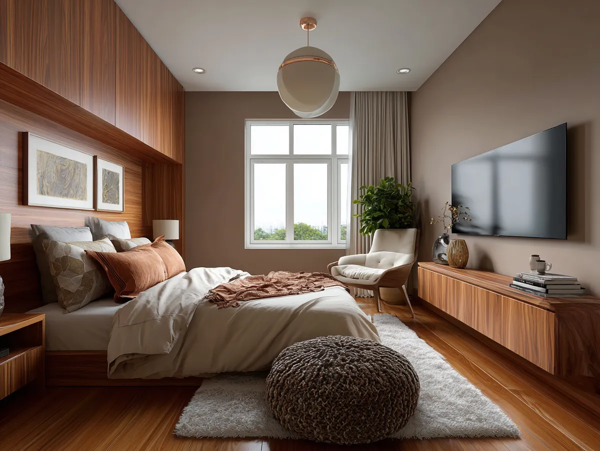When choosing a modern TV panel design in warm wood tones for your bedroom, there are a few key factors to consider. First, consider the type of wood. Different types of wood have different grains, colors, and textures. Choose a type of wood that matches your personal style and the overall decor of your bedroom.