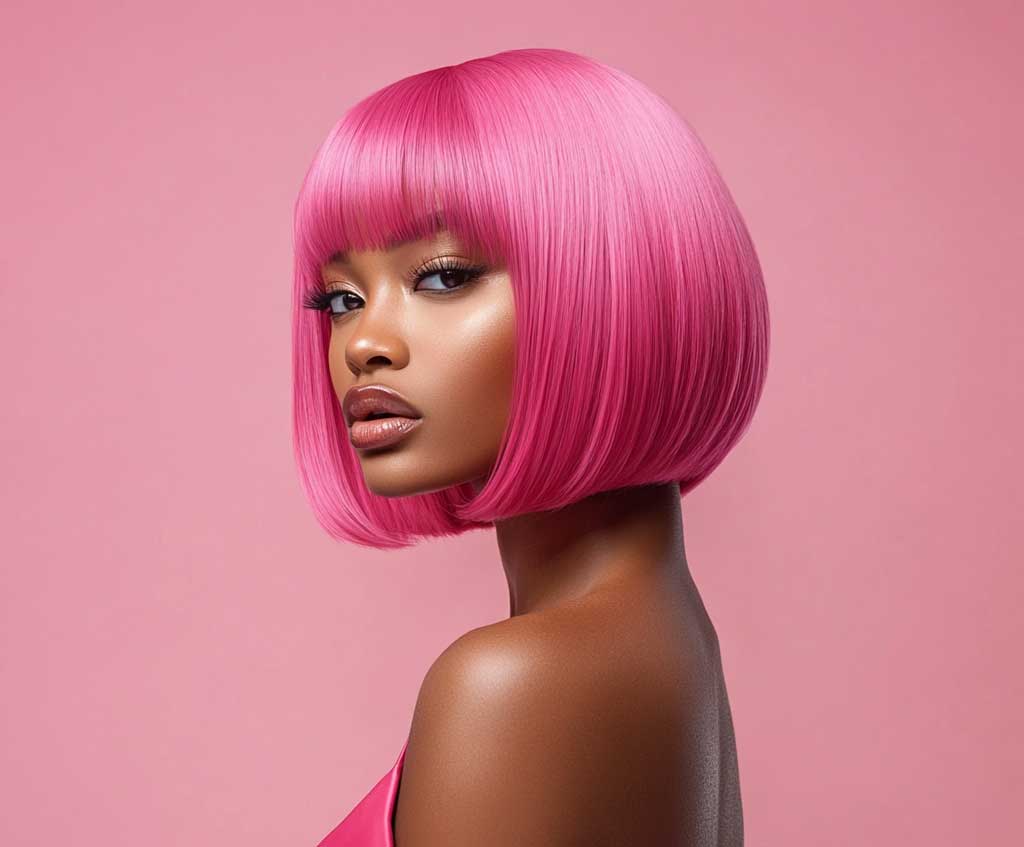 A bright pink quick weave bob is both playful and chic, offering a fresh take on the traditional sleek bob. The glossy layers add dimension and movement, enhancing the hairstyle’s overall appeal.