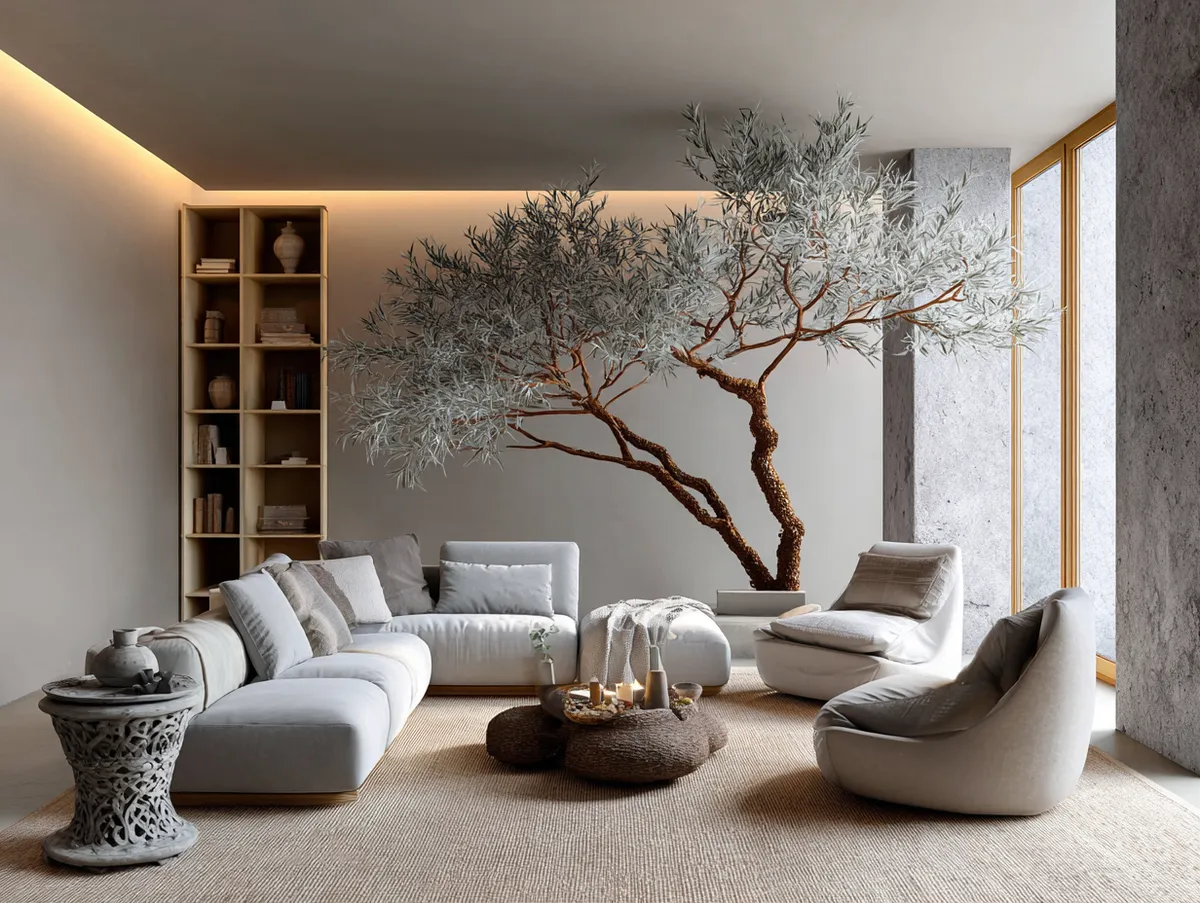 The essence of Japanese interior design lies in the balance between man-made structures and nature. As seen in this image, the harmonious fusion of nature within the living room brings about a unique tranquility and warmth. The natural elements within the space not only represent the cultural connection to nature but also imbue the area with a calming serenity that’s characteristic of Japanese design.