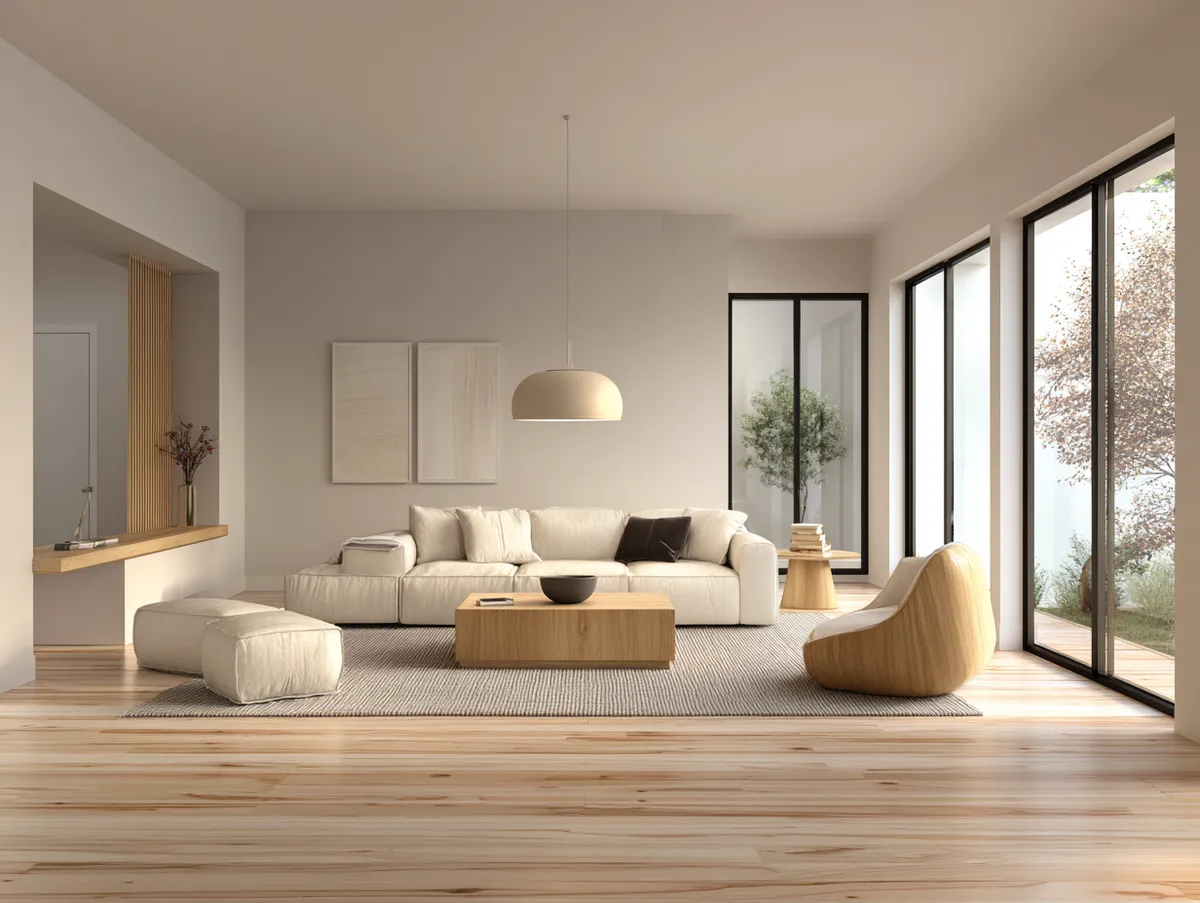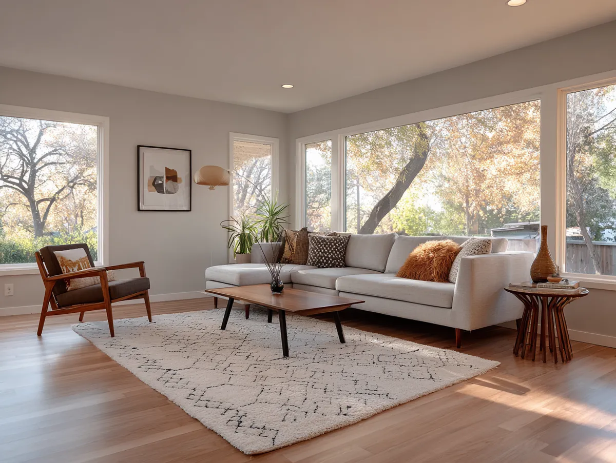 One of the defining characteristics of a mid century modern living room is the celebration of materials. In this design, the rich wood tones and soft fabric textures bring warmth and depth to the minimalist space.