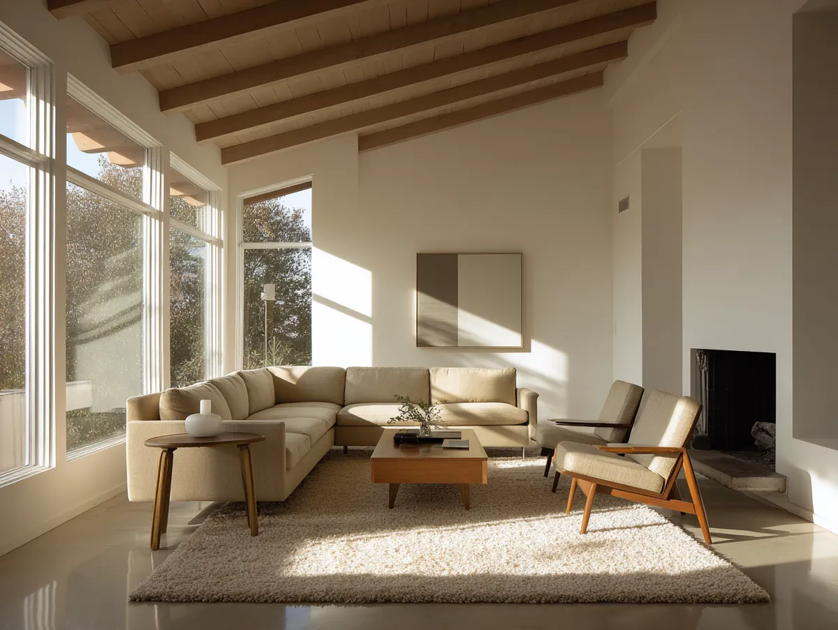 The living room benefits from a neutral color palette, which enhances the sense of space and light. The muted tones provide the perfect canvas for showcasing the beauty of mid-century furniture design.