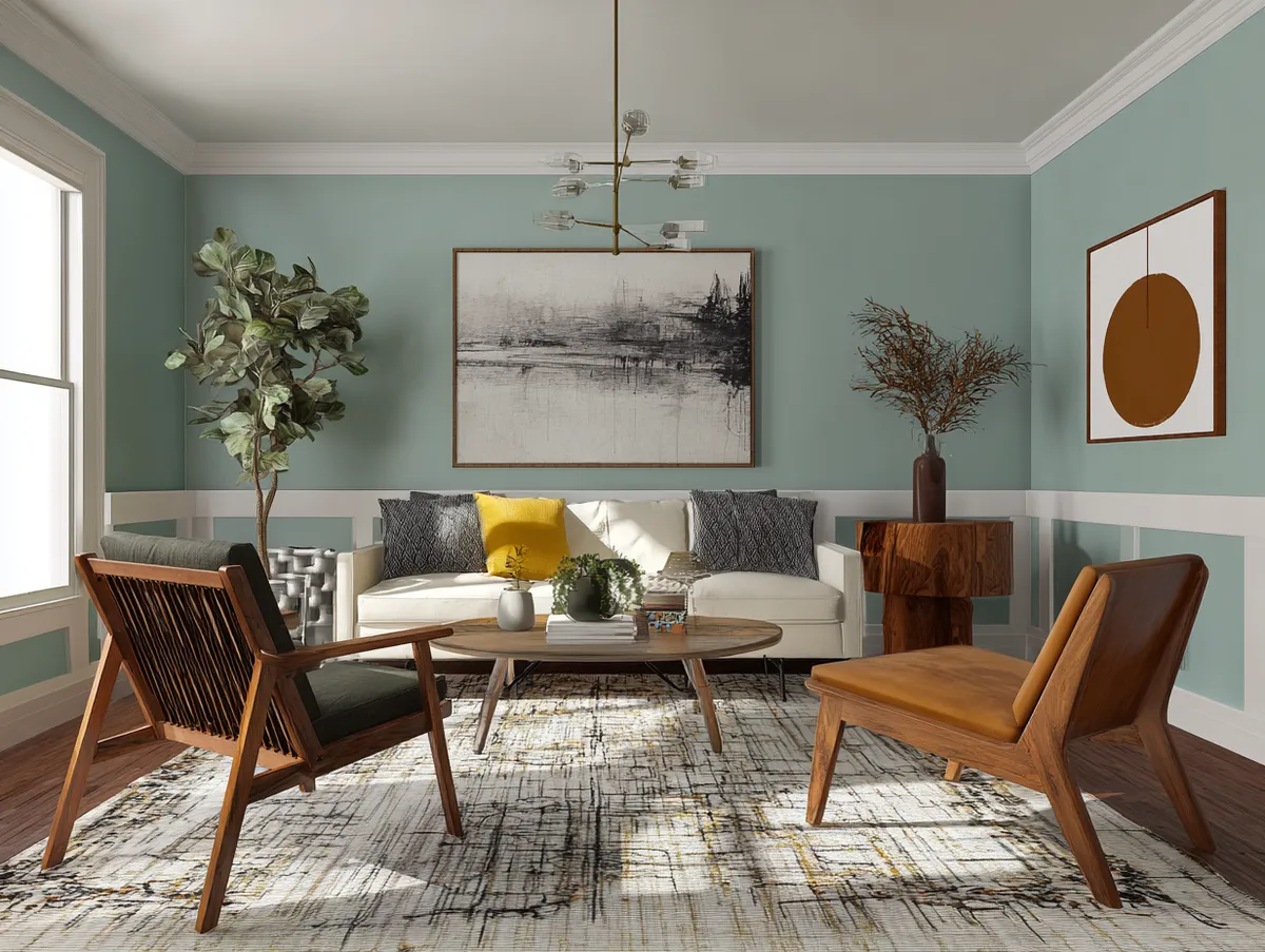 The color palette, inspired by the nature-based hues prevalent in the mid-century era, lends a soothing ambiance to the living room. It provides the perfect backdrop for the iconic furniture pieces, highlighting their design without overpowering them.