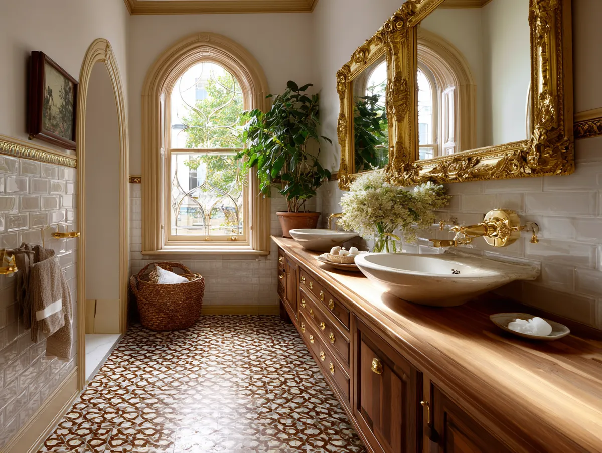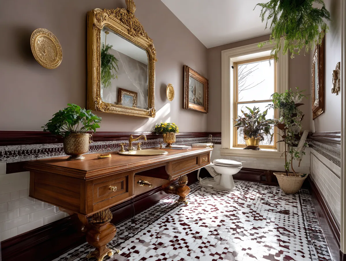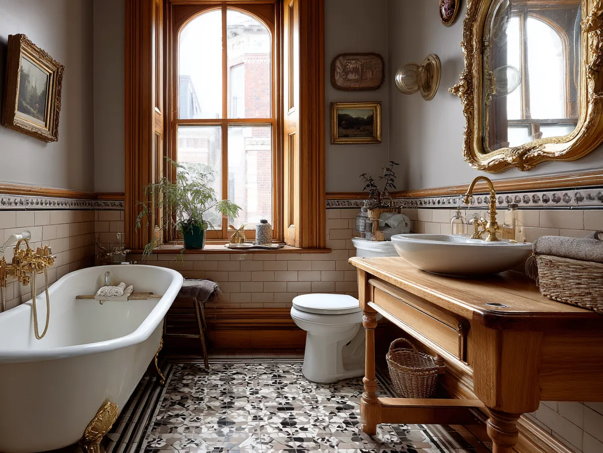 This photo presents a different perspective on Victorian style bathrooms, one where the timeless charm of the Victorian era is expressed through a patterned tile floor, a wooden vanity, and a large gilt mirror.