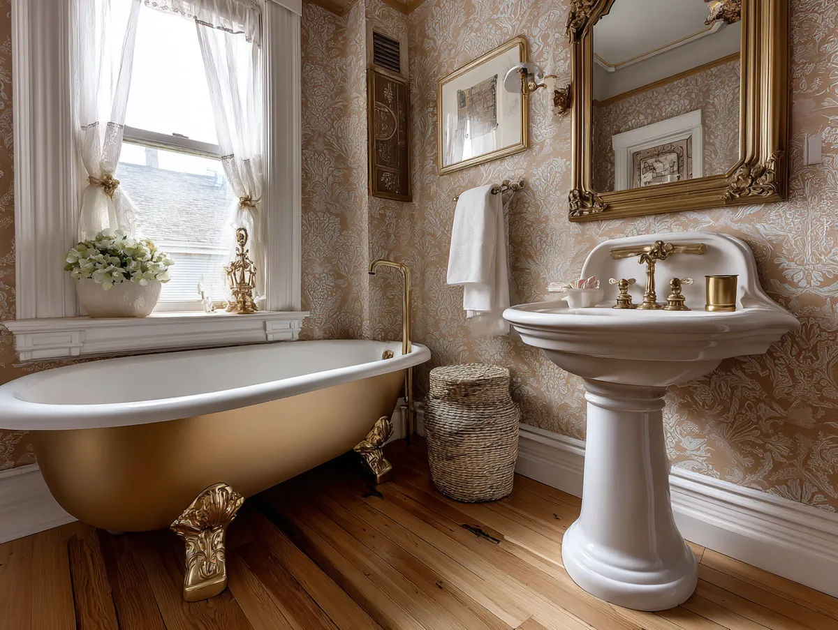 In addition, gold fixtures add a touch of glamour to the bathroom. The golden taps, showerhead, and light fixtures infuse a warm, luxurious vibe, further enhancing the Victorian aesthetic. These metallic elements also provide a captivating contrast against the muted backdrop, adding a layer of richness to the room.