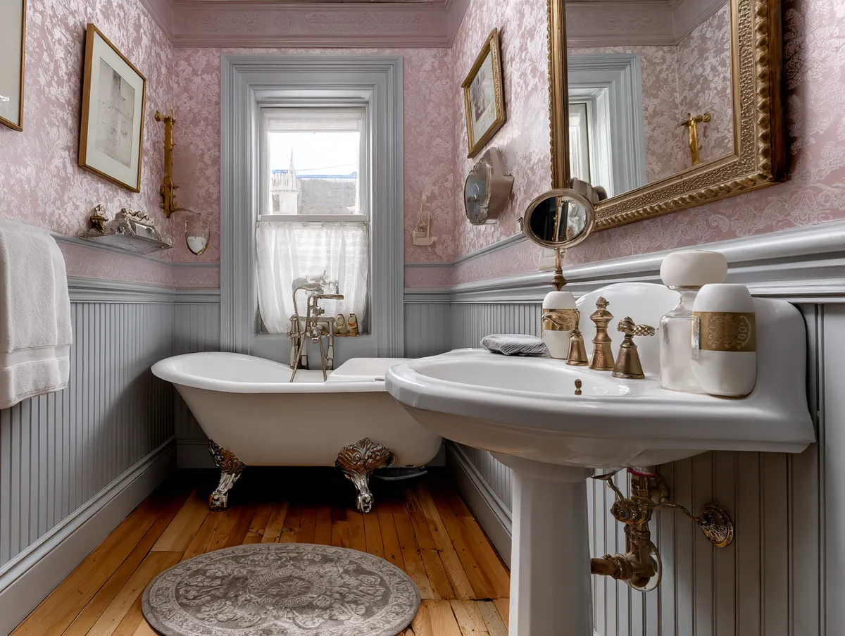 The first photograph captures the inherent elegance of a Victorian style bathroom in all its glory. With its classic clawfoot tub, a traditional pedestal sink, and exquisitely detailed wallpaper, the bathroom beautifully channels the grandeur of the Victorian era.