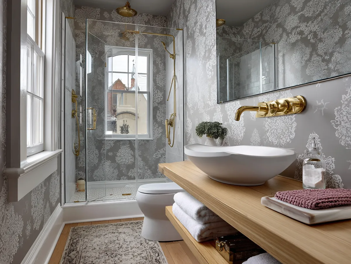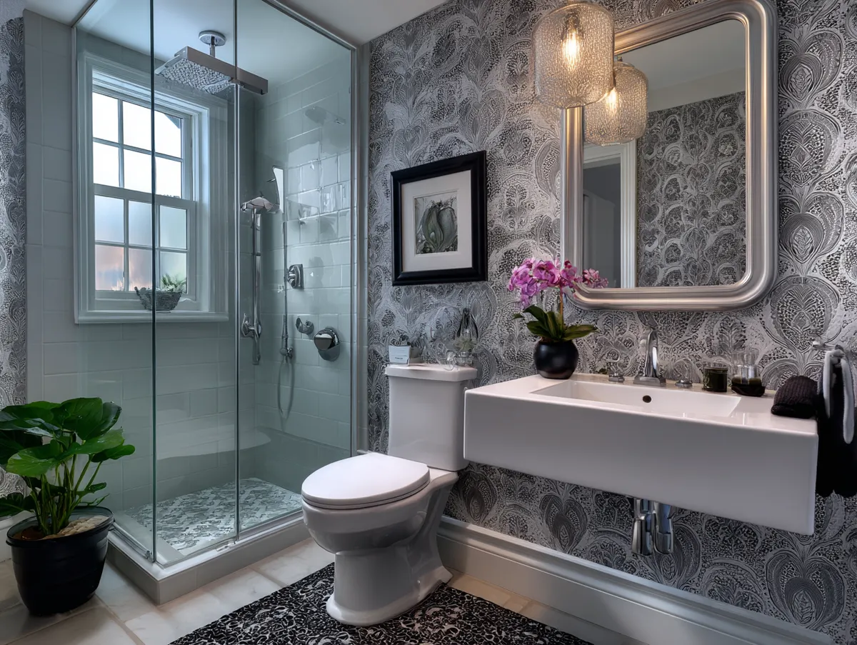 Lastly, natural light floods the bathroom, further accentuating its modern elements and making the space feel airy and bright. It highlights the intricate design of the wallpaper, the sleek surfaces of the fixtures, and the patterned tiles in the shower.
