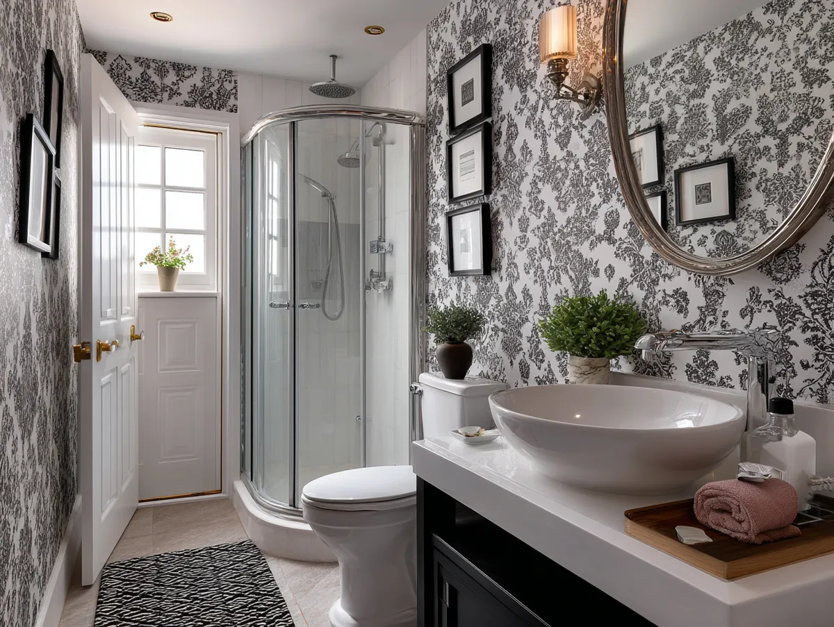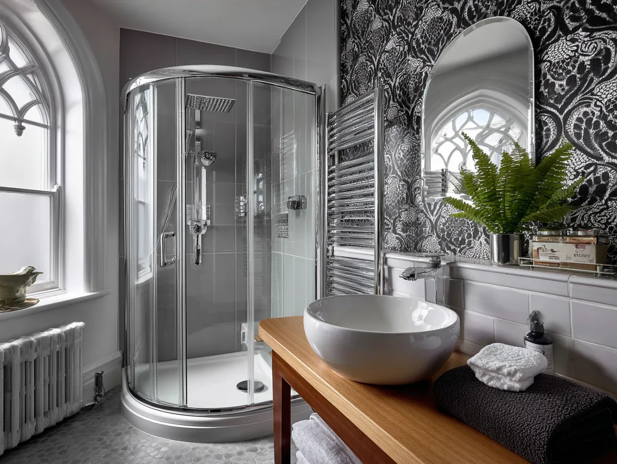 The third photograph offers a fresh take on the Victorian style bathroom, blending traditional elements with contemporary features. A glass-enclosed shower, a modern sink, and monochrome wallpaper coalesce to create a space that is both reminiscent of the Victorian era and decidedly modern.