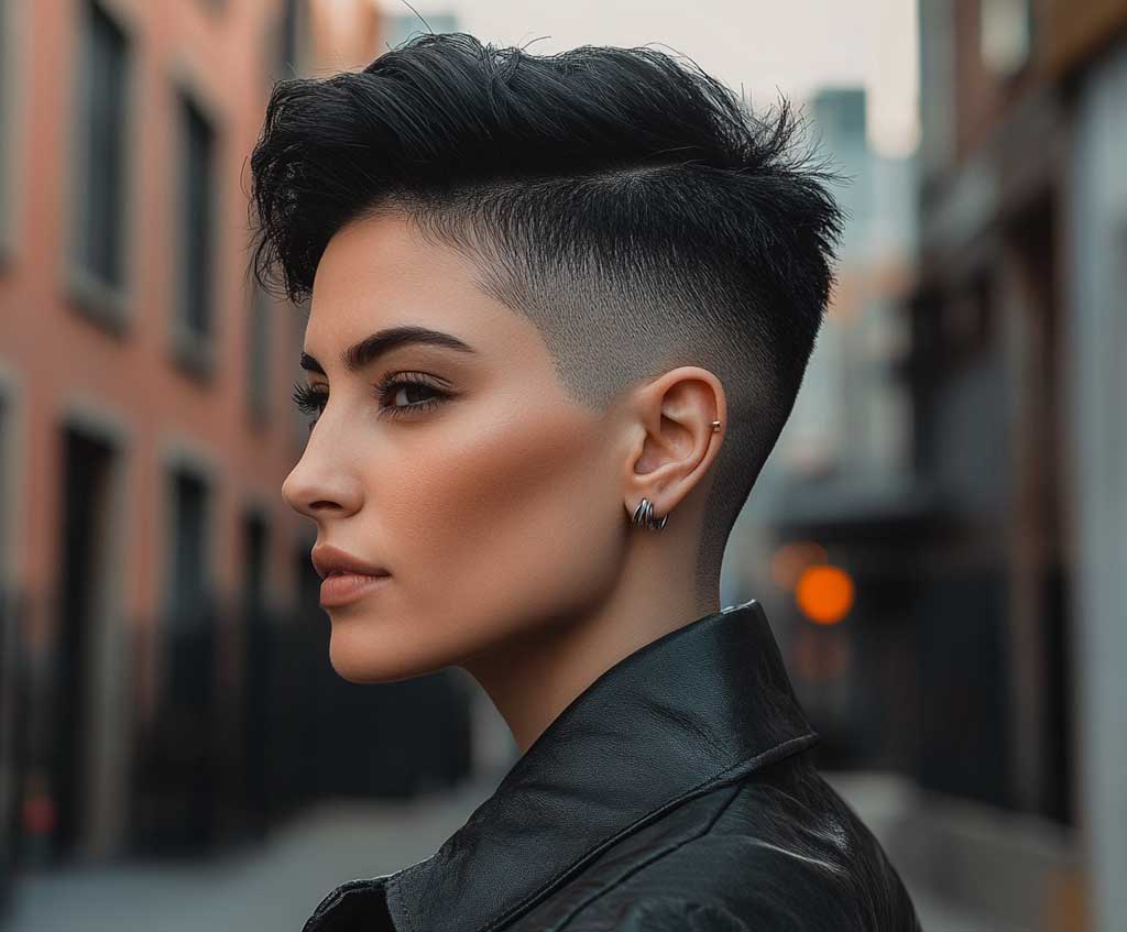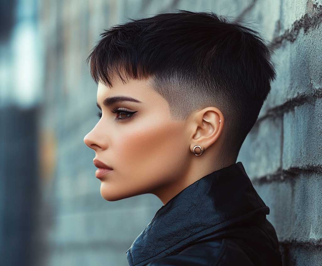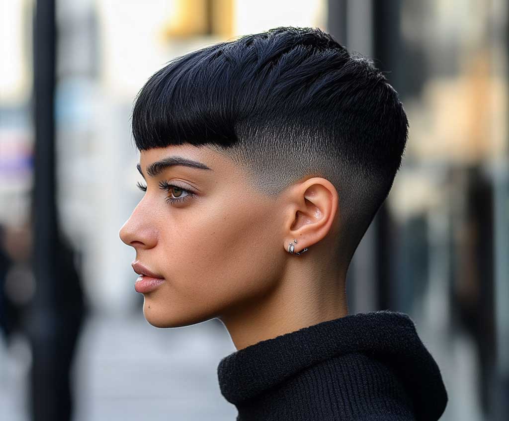 This edgy haircut is perfect for women who want to push boundaries while keeping their style polished and intentional. The mid fade buzz cut with an undercut is a modern, daring take on a classic cut, and when paired with jet black hair, it becomes a statement of individuality and strength.