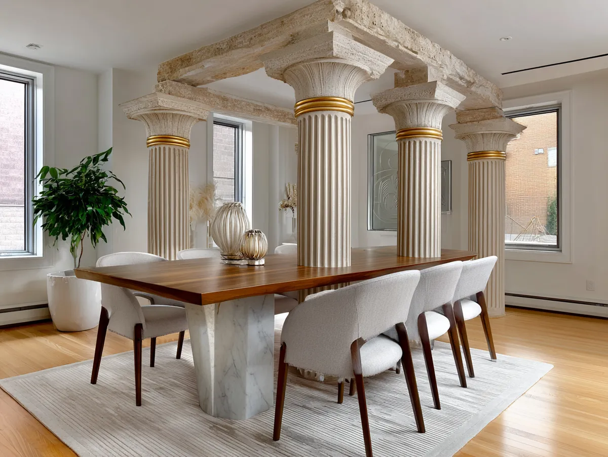 The columns, white and ornately carved, echo the classical beauty of Roman architecture, creating a striking contrast against the contemporary elements of the room.