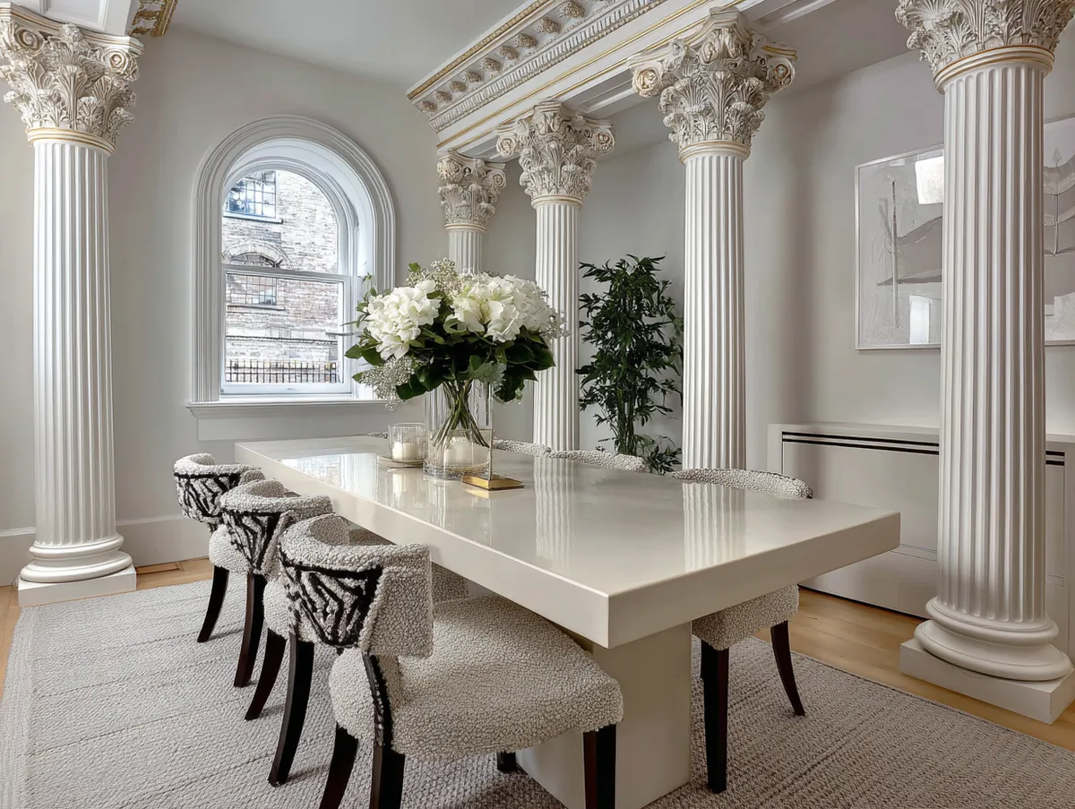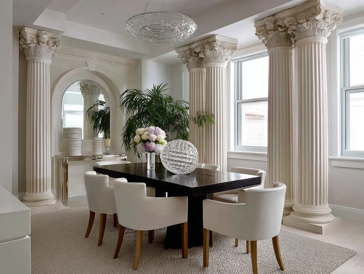 The image presents a modern dining room which has embraced decorative Roman columns as a central design element. The columns help to give the dining area a distinct identity within the open-concept space.