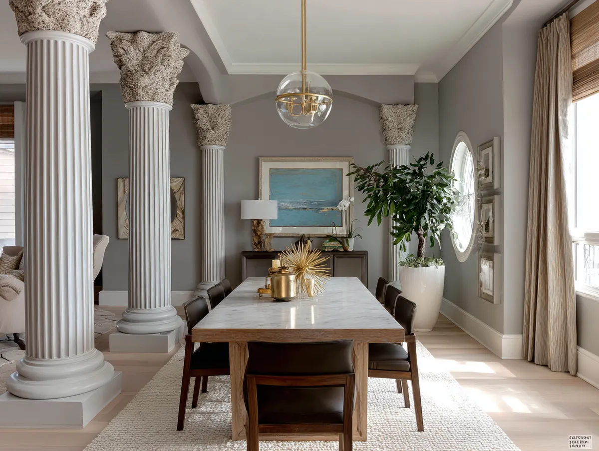 Upon closer inspection, the decorative Roman columns also serve a functional purpose as they subtly demarcate the dining area from the rest of the open floor plan.