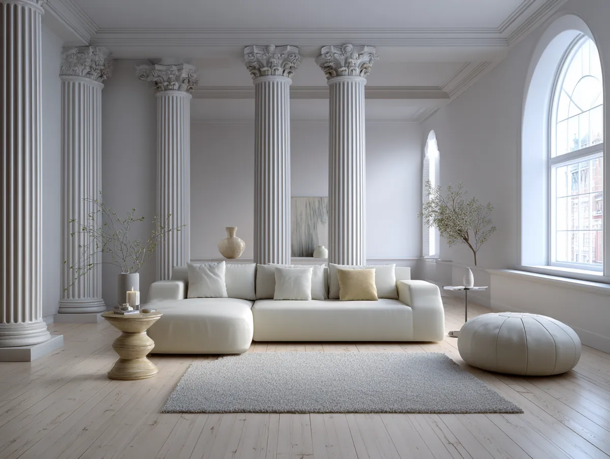 This image showcases a modern living room where simplicity and elegance reign supreme. The room’s spacious design and minimalist decor are highlighted by a pair of decorative Roman columns.