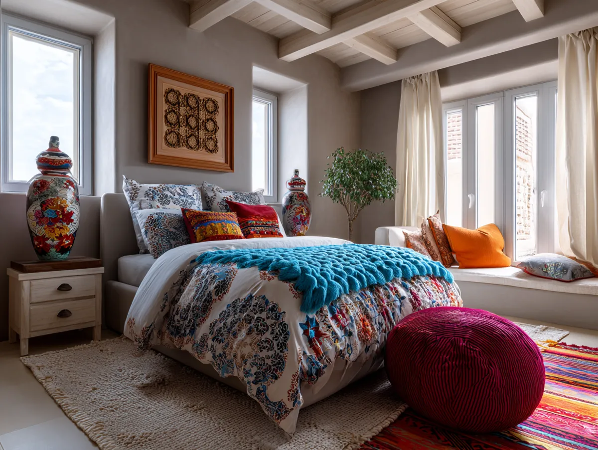 Intricate patterns are a key element of Mediterranean decor and can be incorporated into your bedroom in a variety of ways. One way to incorporate intricate patterns into your bedroom is through textiles. Choose bedding, curtains, and rugs with intricate patterns that reflect the Mediterranean style. For example, you could choose bedding with a damask or paisley pattern, curtains with a geometric or floral pattern, and a rug with a mosaic or tile pattern. These intricate patterns can add visual interest and a touch of elegance to your space.