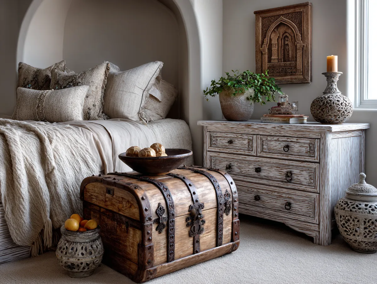 In addition to warm tones and natural textures, Mediterranean decor also includes rustic elements. Rustic elements can be incorporated into your bedroom through the use of distressed wood furniture, wrought iron accents, and ceramic accessories. Consider choosing a distressed wood bed frame or dresser. Additionally, you can incorporate rustic elements into your bedroom through decorative accessories. Choose ceramic vases, wrought iron candle holders, or distressed wood picture frames to add a touch of rustic charm to your space.