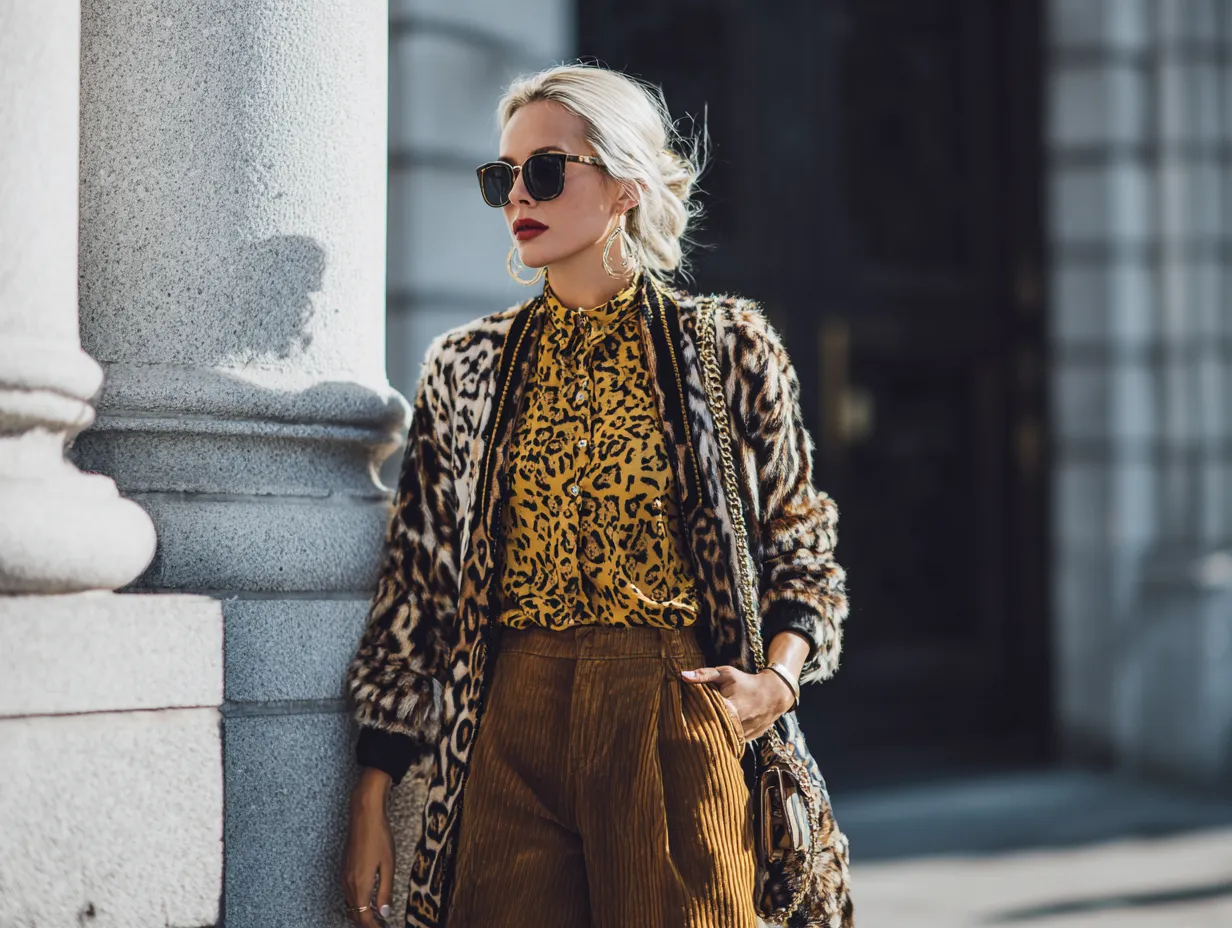 Accessories can make or break this daring combination. When you have so much visual information happening on your body, your choice of shoes, bags, and jewelry must be deliberate. A common mistake is to introduce a third, unrelated bright color, which can overwhelm the look. Instead, opt for solid neutrals that pick up on the darkest tone in your prints, usually black or dark brown. A sharp black stiletto or a structured leather handbag acts as a palate cleanser, giving the eye a place to rest. However, for the truly bold, metallic accessories in gold or bronze can complement the warm tones of the leopard, adding a touch of glamour without introducing a conflicting color. The goal is to frame the mixed patterns, not to compete with them. Every accessory should serve to highlight the boldness of your clothing choices, reinforcing the confidence required to pull off such a complex look.